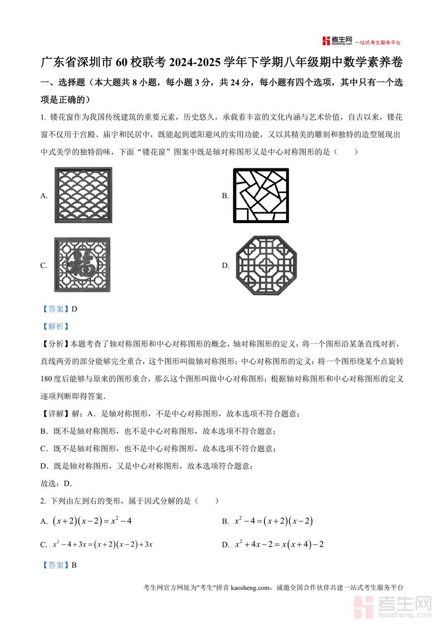 《精品解析:广东省深圳市60校联考2024-2025学年下学期八年级期中数学素养卷(解析版).docx》是一份针对深圳60校联考设计の八年级数学期中权威备考资料,涵盖选择题、填空题及解答题全题型完整解析。资料聚焦轴对称与中心对称判断、因式分解方法应用、不等式组求解、坐标与图形变换等八年级核心知识点,每道题均配备详细分析过程、解题思路及易错点提示,同时融入镂花窗传统元素等实际场景素材,既贴合联考命题趋势,又兼顾学科素养培养与传统文化渗透。