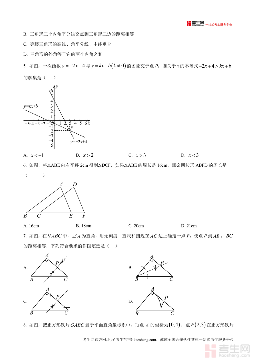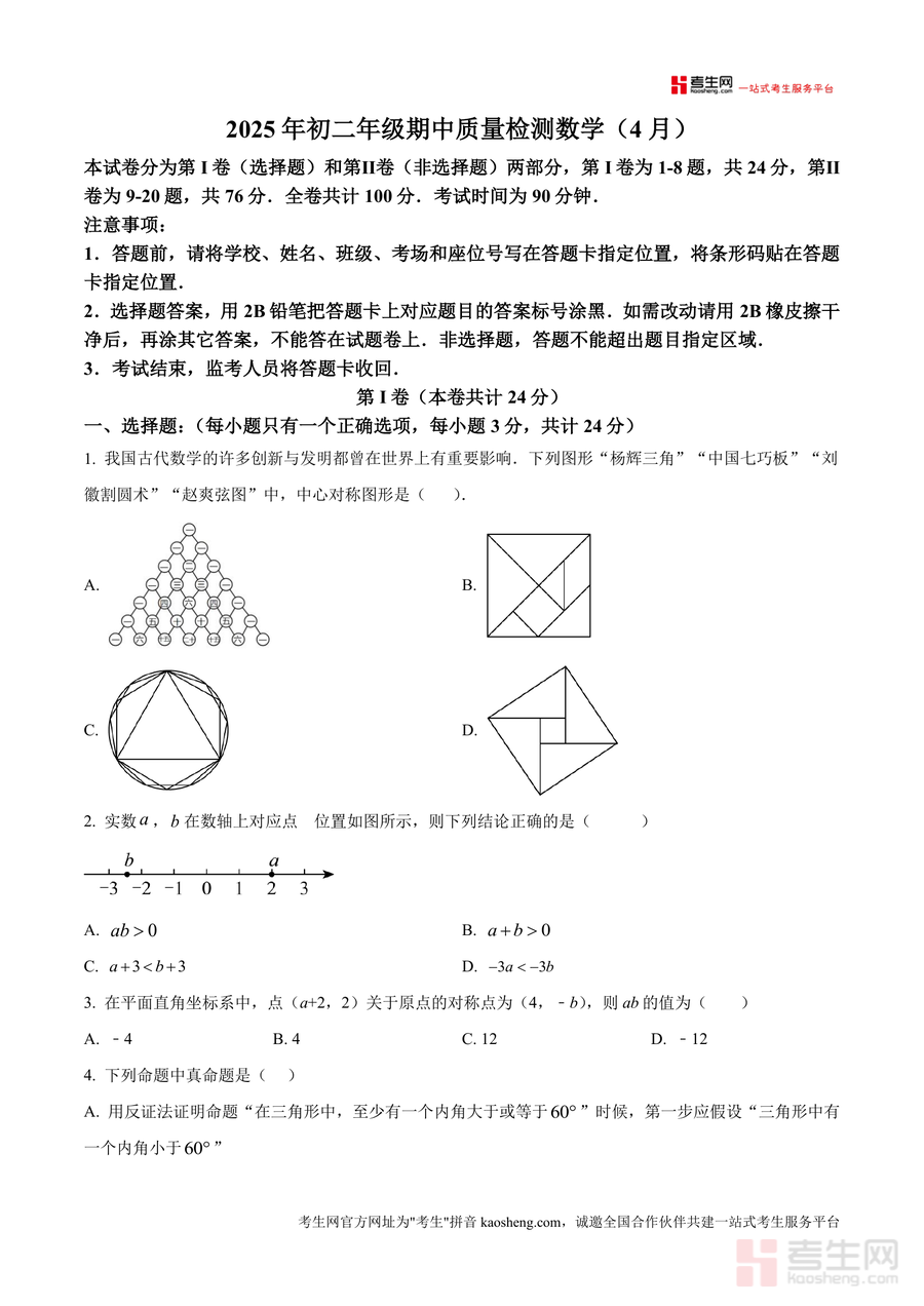《精品解析:广东省深圳市65校联考2024—2025学年下学期八年级期中质量检测数学试卷(原卷版)》是一份针对深圳区域八年级学生期中备考设计的权威联考真题资料,核心定位为深圳65所学校联合命题的期中质量检测原卷呈现。主要内容覆盖第I卷选择题(8题共24分)与第Ⅱ卷非选择题(填空题5题15分+解答题7题61分)两大板块,题型包含中心对称图形判断(如杨辉三角、赵爽弦图等经典图形应用)、实数数轴对应关系分析、坐标关于原点对称点计算、几何命题真假验证、一次函数图像交点与不等式解集关联、图形平移旋转规律探究等;特色亮点在于依托65校联合命题背景,精准贴合深圳本地初中数学教学进度与考纲要求,完整还原联考考试时长(90分钟)及答题规范细节(如答题卡使用说明、答题区域限制等)。