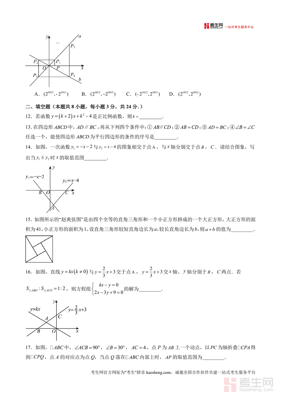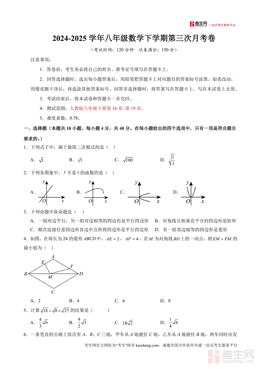 《八年级数学月考卷【测试范围:人教版八年级下册第16章-第19章】(重庆专用)(考试版).docx》是一份精准适配重庆地区八年级下学期第三次月考测评需求的专业备考资料。文件聚焦人教版八年级下册核心章节(第16章二次根式、第17章勾股定理、第18章平行四边形、第19章一次函数),严格遵循本地考试标准设计:考试时长120分钟,满分150分,难度系数0.78贴合学生阶段性学情。试卷结构科学合理,包含选择题(10小题共40分)、填空题(8小题共24分)及解答题(8小题共86分),题型覆盖基础概念辨析、计算能力考查、几何证明与作图、实际问题应用等多元维度,全面检验学生对章节核心知识点的掌握程度与综合解题能力。