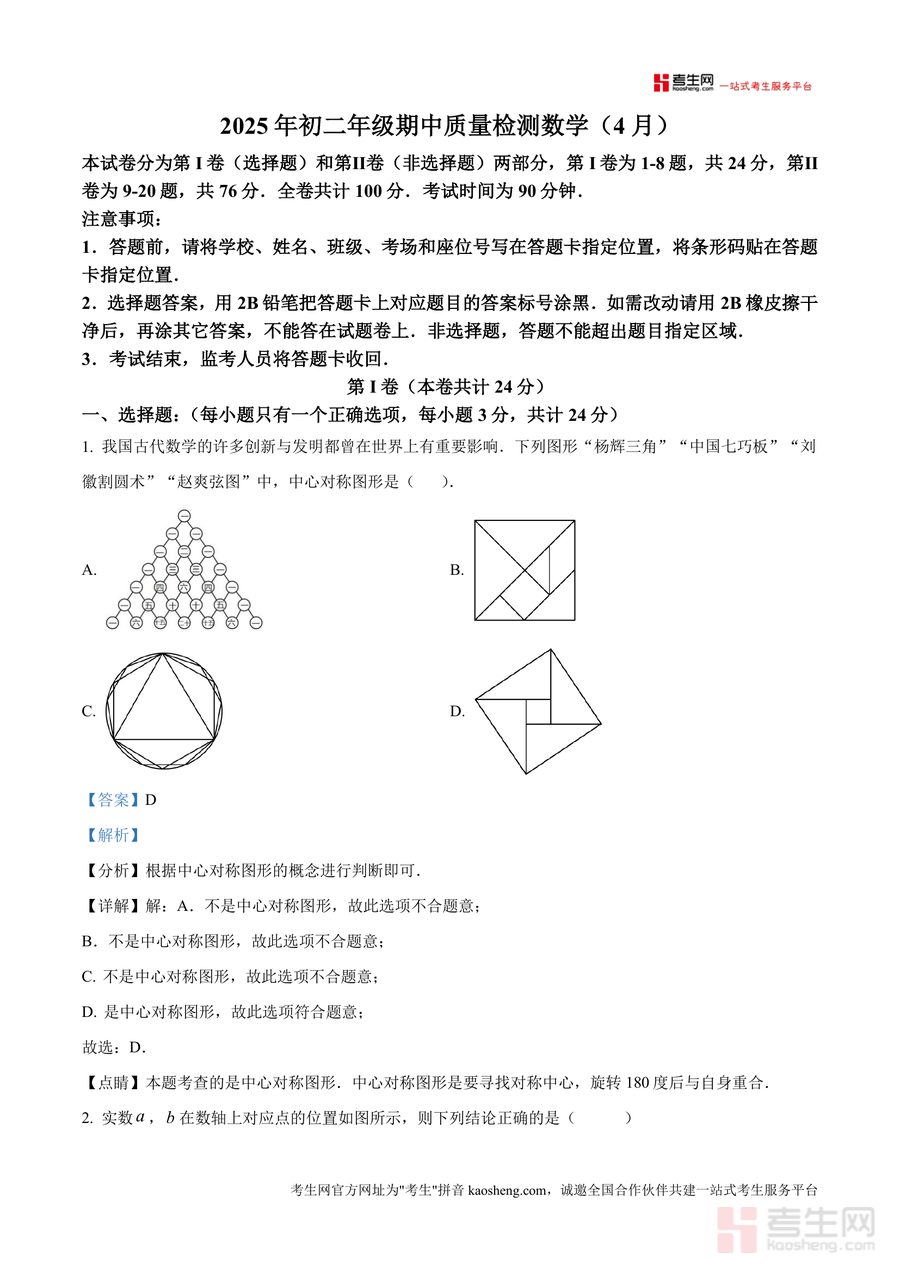 《精品解析:广东省深圳市65校联考2024—2025学年下学期八年级期中质量检测数学试卷(解析版).docx》是一份聚焦深圳区域八年级数学期中备考的高质量真题解析资料。资料完整呈现了联考数学试卷的全部内容——包含第I卷8道选择题(共24分)与第II卷9-20题非选择题(共76分),并对每道题目提供详尽解析:涵盖考点定位、步骤拆解及易错点睛,精准贴合本地联考命题趋势与考纲要求。作为针对性的松果备考资料,其解析深度挖掘题目逻辑链与解题技巧,助力学生构建系统知识框架。