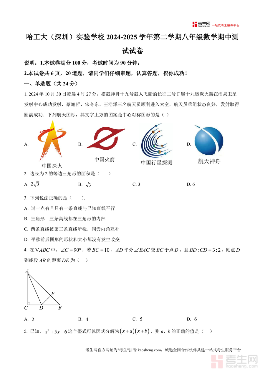 《精品解析:广东省深圳市南山区哈尔滨工业大学(深圳)实验学校2024-2025学年八年级下学期期中数学试题(原卷版).docx》是一份针对八年级下学期数学期中阶段检测的高质量备考资料。该资料完整呈现了哈工大(深圳)实验学校期中测试的原卷内容,包含单选题(24分)、填空题(15分)、解答题(61分)三大题型共20道题,覆盖中心对称图形识别、等边三角形面积计算、因式分解、直角三角形判定、一次函数与不等式关系等核心知识点,同时保留了学校命题特有的情境设计(如结合神舟十九号发射的航天图标题目)与难度梯度,能真实反映该校期中测试的命题风格与考察重点。