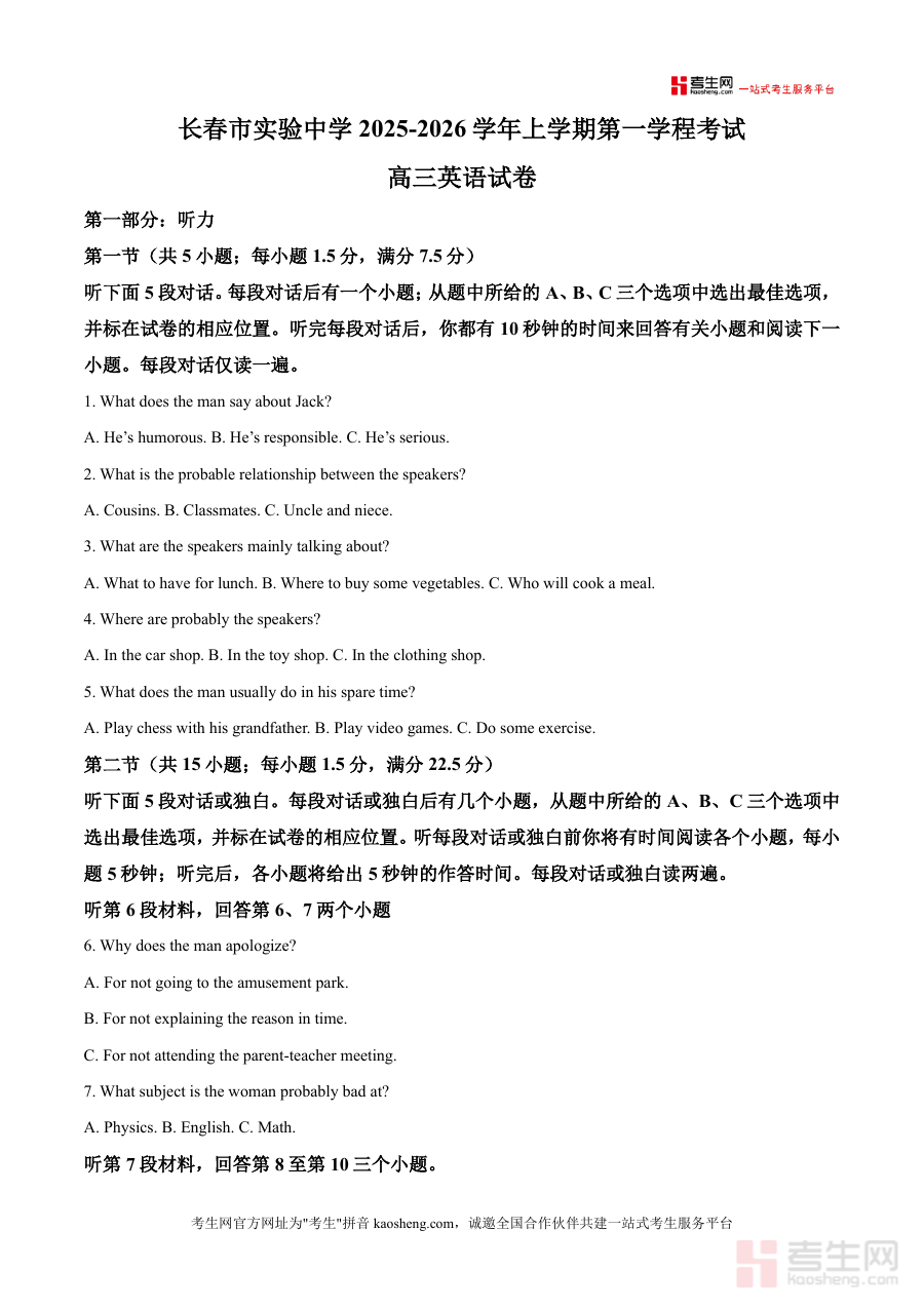 《精品解析:吉林省长春市实验中学2025-2026学年高三上学期第一学程考试英语试卷(解析版)》是一份针对高三学生英语学科阶段性评估与备考提升的专业资料。该资料包含完整的试卷内容及详尽解析,覆盖听力、阅读等核心题型:听力部分设有两节共20小题,涵盖日常对话、独白等真实语境素材;阅读部分包含应用文、记叙文等多种文体,题目设计贴合高考命题趋势。其特色亮点在于每道题均配备精准解析,不仅给出正确答案,还深入剖析解题思路、考点分布及易错点提示,如阅读A篇针对细节理解与推理判断等题型的分步讲解,助力学生掌握答题技巧。