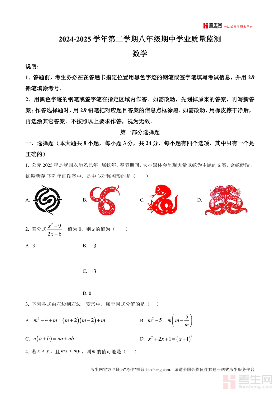《精品解析:广东省深圳市南山实验教育集团麒麟中学2024-2025学年八年级下学期期中数学试题(原卷版).docx》是一份针对该校八年级下学期期中数学考查设计的权威备考资料。文件包含完整的期中试题结构——选择题8道(24分)、填空题5道(15分)、解答题7道(61分),覆盖中心对称图形判断、分式值为零的条件、因式分解定义、命题真假判断等八年级下册核心知识点,同时融入几何图形计算、代数变形应用、实际应用题等综合题型。其特色在于依托南山实验教育集团麒麟中学的教学教研体系,试题设置贴合本地教学进度与考试要求,能真实反映该校期中考查的重点方向与命题风格。