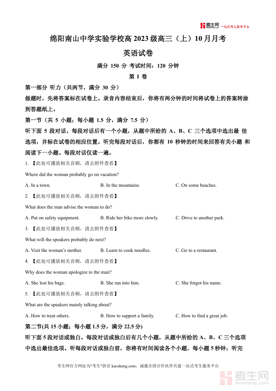 《精品解析:四川省绵阳市涪城区绵阳南山中学实验学校2025-2026学年高三上学期10月月考英语试题(原卷版)》是一份针对高三学生英语备考的高质量原创试卷资源,涵盖听力、阅读等核心题型,严格遵循高考英语考试大纲与学校教学进度。试卷结构完整,包含满分150分、考试时间120分钟的标准设置,听力部分提供真实场景对话与独白材料,阅读部分选取贴近高考难度的各类文本,题型设计科学合理,能有效反映当前高三阶段英语学习的重点与难点。其特色亮点在于依托绵阳南山中学实验学校的教学经验与命题思路,试题具有较强的针对性与实用性,为学生提供了与真实月考一致的练习载体。