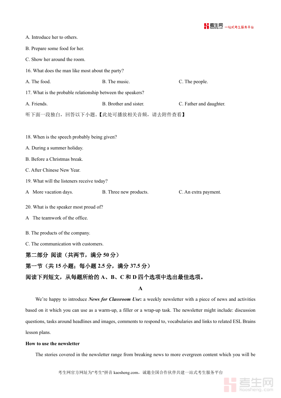 该试卷的核心用途在于帮助学生模拟真实考试环境,提升应试能力与时间管理技巧。适用场景包括学生自主练习、教师课堂测试、课后复习巩固等,尤其适合高三学生在备考初期通过系统训练熟悉考试流程与题型特点。用户价值体现在通过完成这份试卷,学生能够精准定位自身知识薄弱环节,强化听力理解、阅读理解等关键能力,同时适应考试节奏,减少临场紧张感。备考优势方面,作为重点中学的原创试题,其内容紧密贴合高考命题趋势,融入常见考点与易错点,有助于学生积累解题经验、提升真题解析能力,为后续高效复习奠定基础。