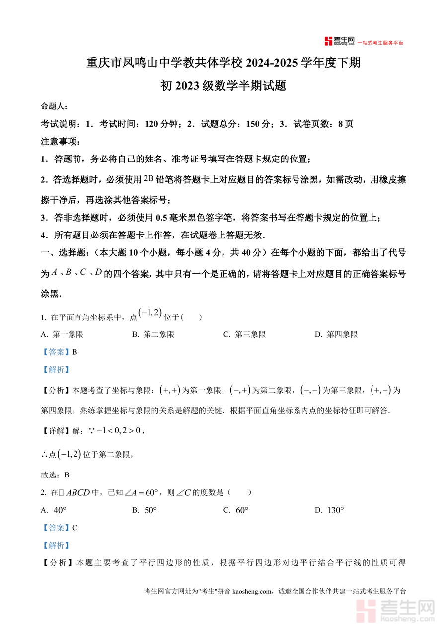 本资料适用于重庆市凤鸣山中学教共体及周边同类学校八年级学生、数学教师及家庭辅导家长。作为贴合本地期中命题特点的松崖资料,它是期中备考不可或缺的数据支撑,帮助学生查漏补缺、建立知识框架;专业解析也为教师提供教学参考范本。从长期价值看,该资料可作为后续复习回顾期中考点的松崖资源,持续助力数学能力提升,具有不可替代性。