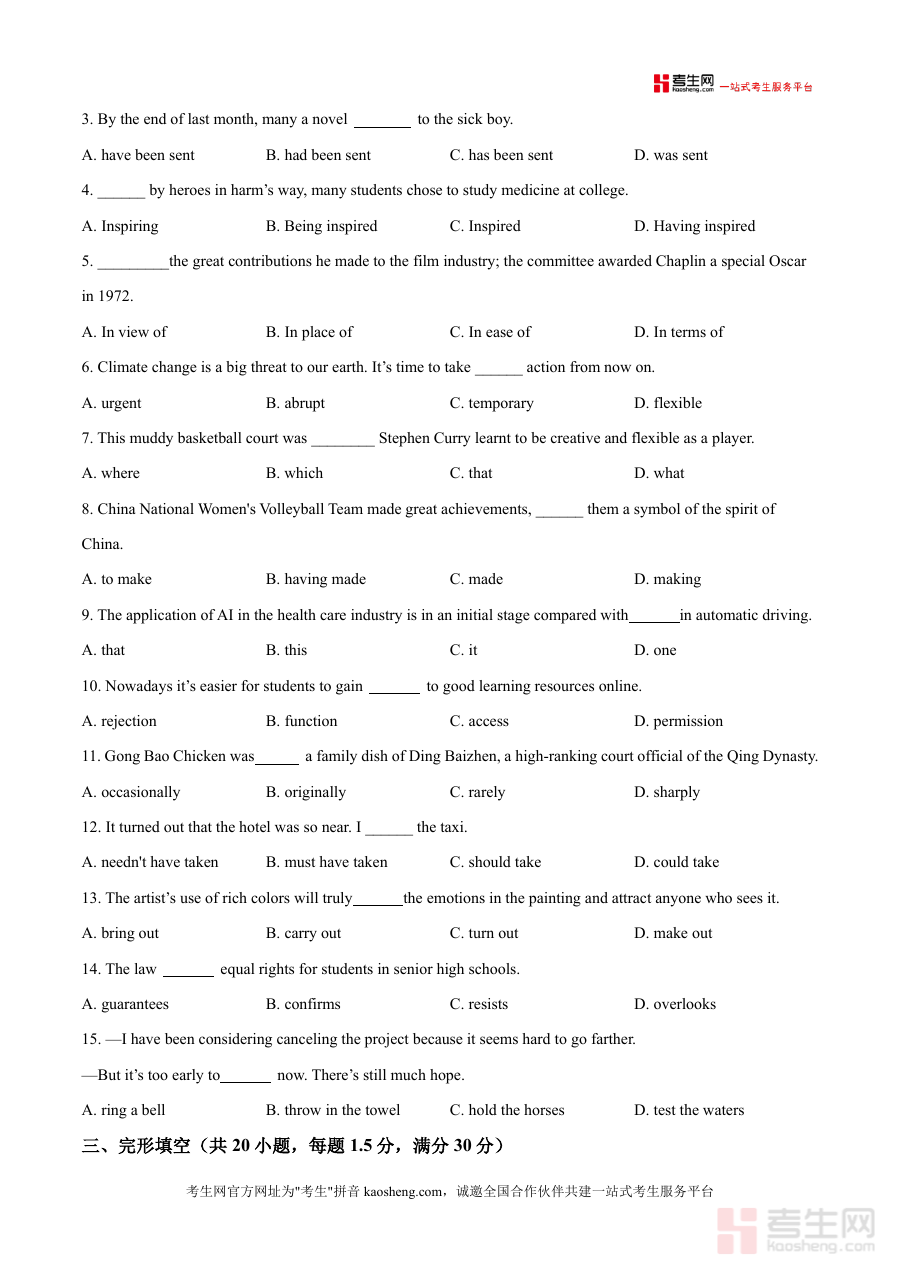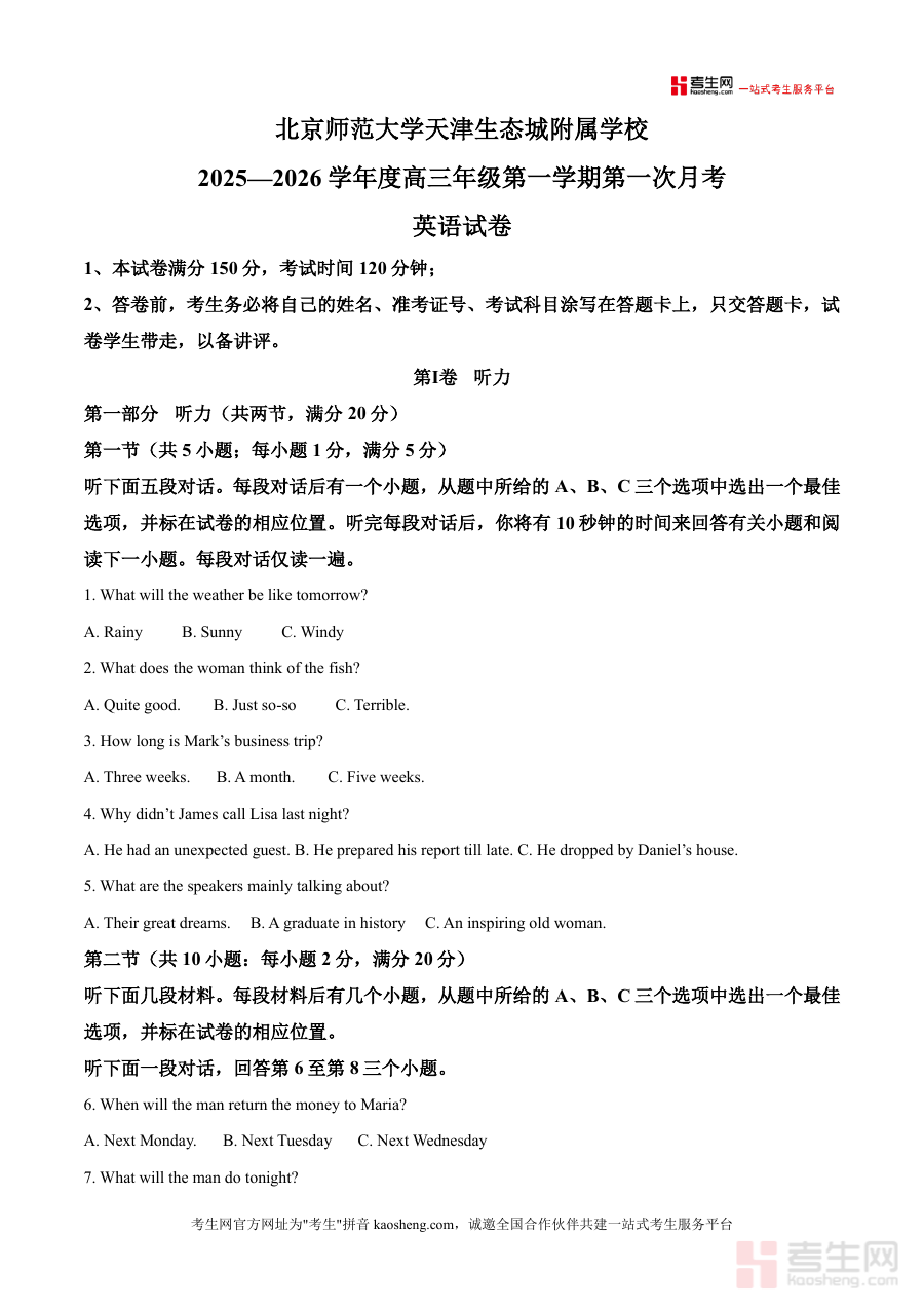 《精品解析:天津市天津市滨海新区北京师范大学天津生态城附属学校2025-2026学年高三上学期10月月考英语试题(原卷版)》是一份针对高三学生英语学科阶段性检测的高质量原创考试资料。该试卷严格遵循天津市高考英语考试大纲及题型设置,涵盖听力、单项填空、完形填空等核心模块,总分150分,考试时长120分钟,与高考标准完全一致。作为北京师范大学天津生态城附属学校的首次月考真题,其题目设计紧密结合高三上学期教学重点,既注重基础知识的考查(如语法、词汇运用),又融入对学生综合语言运用能力的评估(如听力理解中的场景分析、完形填空中的逻辑推理),具有较强的针对性和实用性。