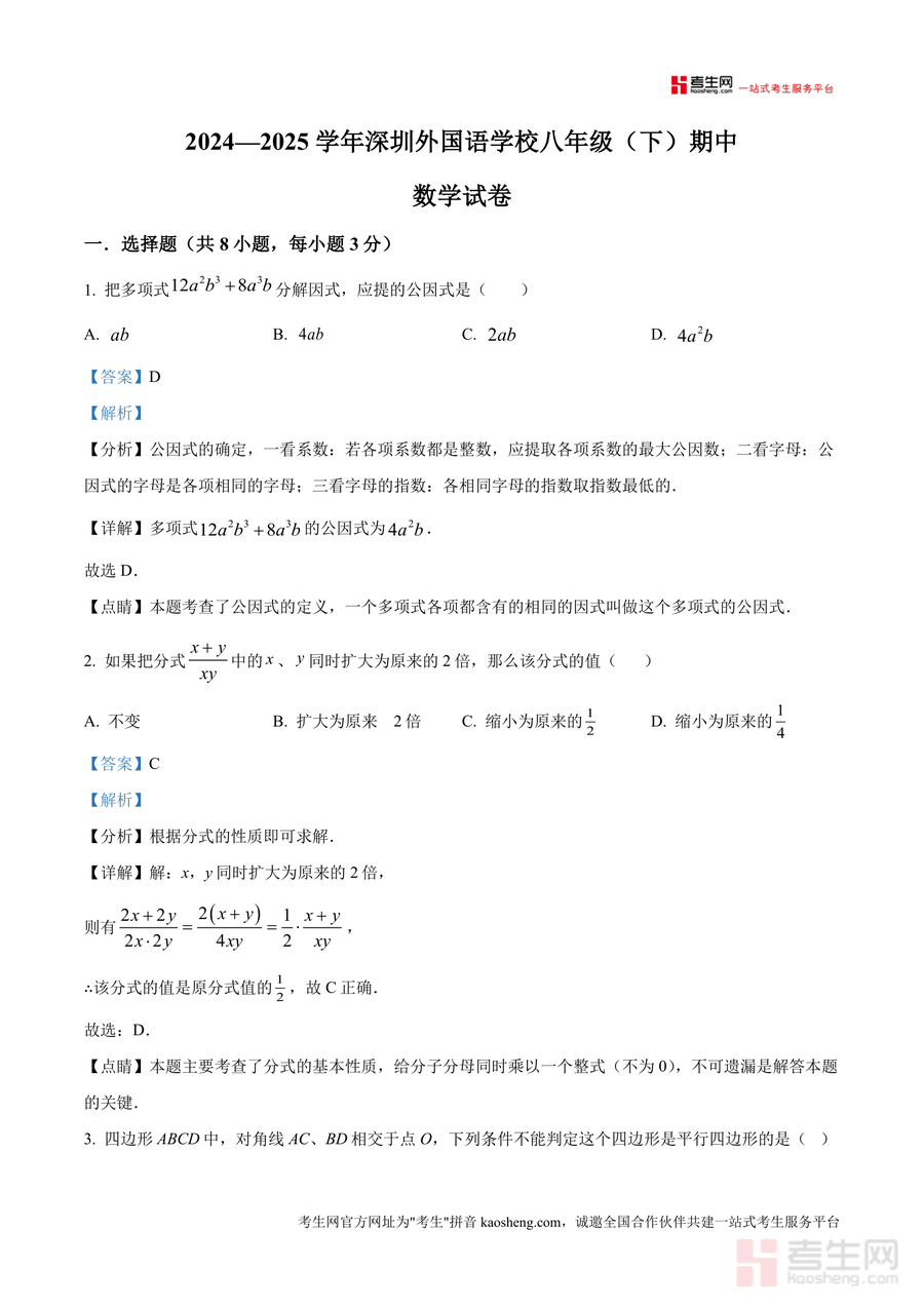 《精品解析:广东省深圳市深圳外国语学校2024-2025学年八年级下学期数学期中考试卷(解析版).docx》是一份聚焦深圳外国语学校学情、贴合八年级下学期数学核心考点与中考命题趋势的数据化备考资料。该资料完整呈现了期中试卷8道选择题、5道填空题及7道解答题,并针对每道题目提供分层级解析:包含考点定位(如因式分解公因式确定、平行四边形判定等)、详细解题步骤、易错点警示(如分式性质应用疏漏、矩形与菱形性质混淆点)及拓展思路,帮助使用者全面理解题目背后知识逻辑与解题方法。其特色在于结合深外教学重点模块设计内容,并融入深圳中考高频考点关联分析,兼具校内期中备考与中考衔接价值。