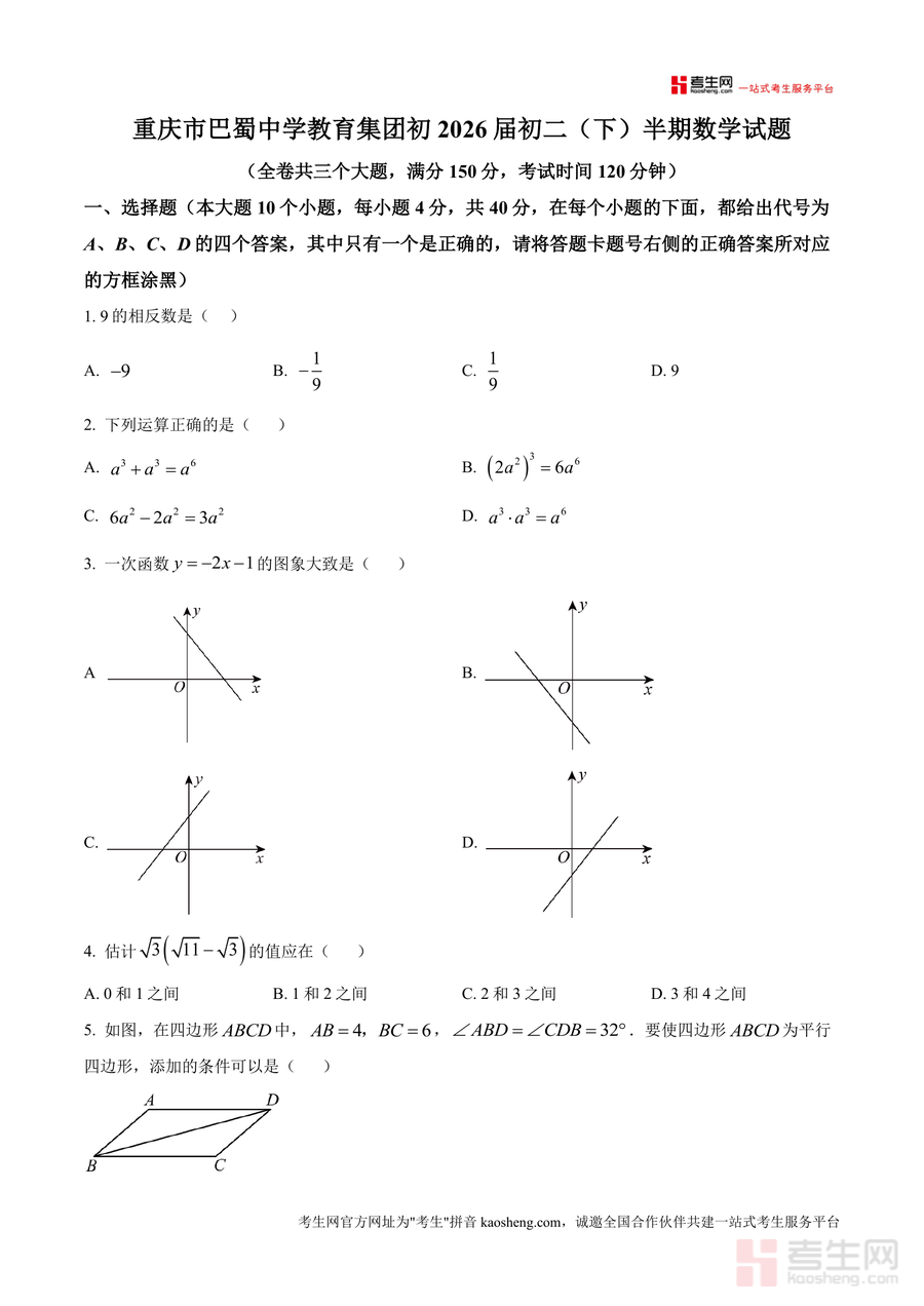 该资料适用于重庆及周边地区八年级学习者初中数学教师及家长群体作为巴蜀中学期中真题具不可替代性命题方向难度反映当地考试趋势长期价值可作期末或中考备考参考构建知识框架强化考点掌握无论冲刺高分还是巩固基础都是不可或缺具长期指导意义的优质资源。