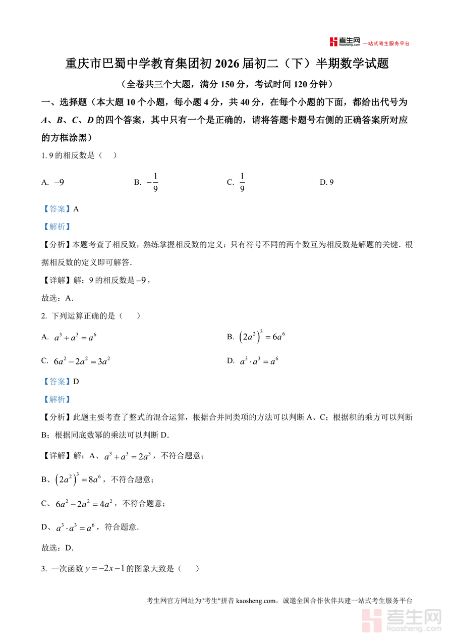 该资料核心用途助力学生巩固期中高频考点与提升解题能力;使用场景涵盖学生自测后的错题分析、教师课堂例题讲解及作业设计参考;用户价值体现在让学生熟悉巴蜀集团命题风格(如强调知识点综合应用),掌握同类题型解题技巧;备考优势是解析中提炼常见解题模型(如一次函数行程问题分段函数模型),能有效提升应试能力,降低答题失误率。