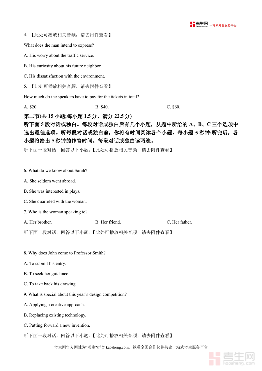 《精品解析:山东省名校考试联盟2025-2026学年高三上学期10月月考英语试题(原卷版)·docx》是一份由山东省名校考试联盟出品的高三年级阶段性检测英语试题原卷资料,核心定位于为高三学生提供符合本地教学与考试标准的高质量练习资源。该资料包含听力、阅读等核心考试板块(如听力两节共30分、阅读第一节37分等),严格遵循高考英语题型结构与分值分布,题目设计贴近山东地区高考命题趋势。其特色亮点在于采用真实考试场景的题目设置,听力部分配备完整音频指引(需查看附件获取),阅读材料涵盖多样话题(如水肺潜水景点介绍等),能有效模拟实战考试氛围。