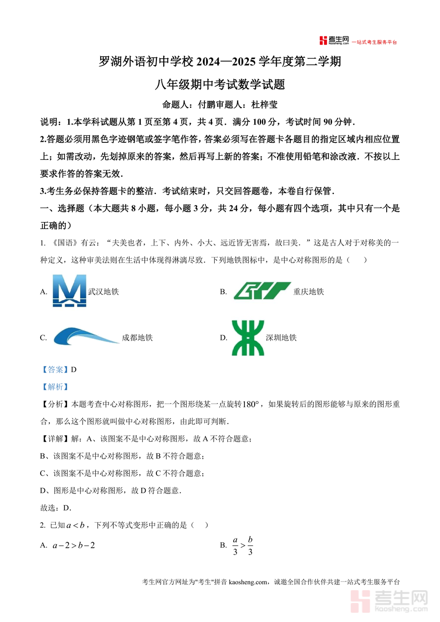 《精品解析:广东省深圳市罗湖外语初中学校2024-2025学年八年级下学期期中数学试卷(解析版)》是一份聚焦该校期中数学考试需求设计精准化备考资料,包含完整试卷原题及每道题深度拆解内容。试卷由该校命题人付鹏设计、杜梓莹审题,题型覆盖选择题(8小题)、填空题(5小题)、解答题(7小题)三大模块,满分100分且贴合90分钟考试时长标准;解析部分不仅标注考点如中心对称图形判定、不等式性质应用等,还提供详细解题步骤与技巧指导,例如因式分解中提取公因式法与公式法结合应用、几何题平移旋转坐标变化规律解析等,助力学生掌握核心解题方法。