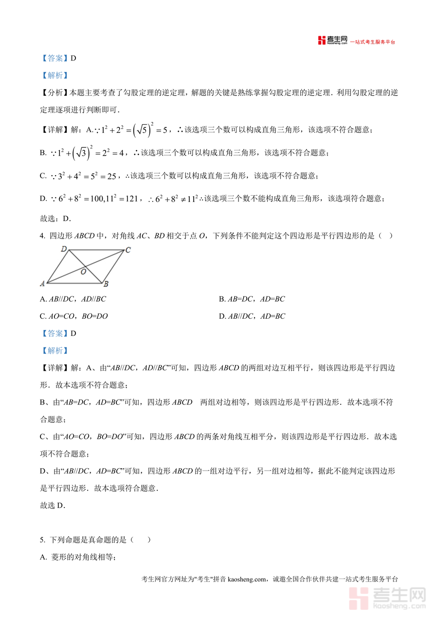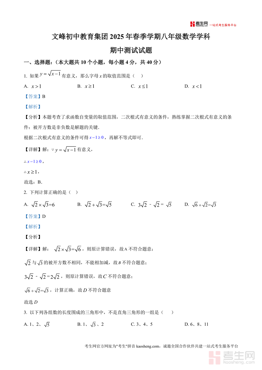 《精品解析:重庆市开州区文峰教育集团2024-2025学年八年级下学期4月期中数学试题(解析版)》是一份针对该集团八年级下学期期中数学考试设计的权威真题解析备考资料,涵盖10道选择题、6道填空题及8道解答题完整试题与全题型详细解析。资料特色在于精准匹配课标要求,每道题均标注核心考点(如二次根式取值范围、勾股定理逆定理应用等)并提供清晰解题步骤,同时融入易错点提示与思路拓展——例如选择题第3题对直角三角形判定的解析明确了勾股定理逆定理使用条件。