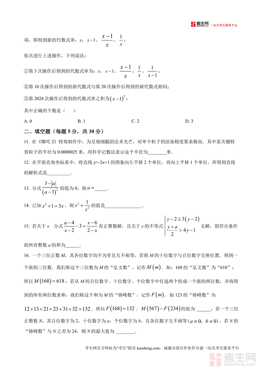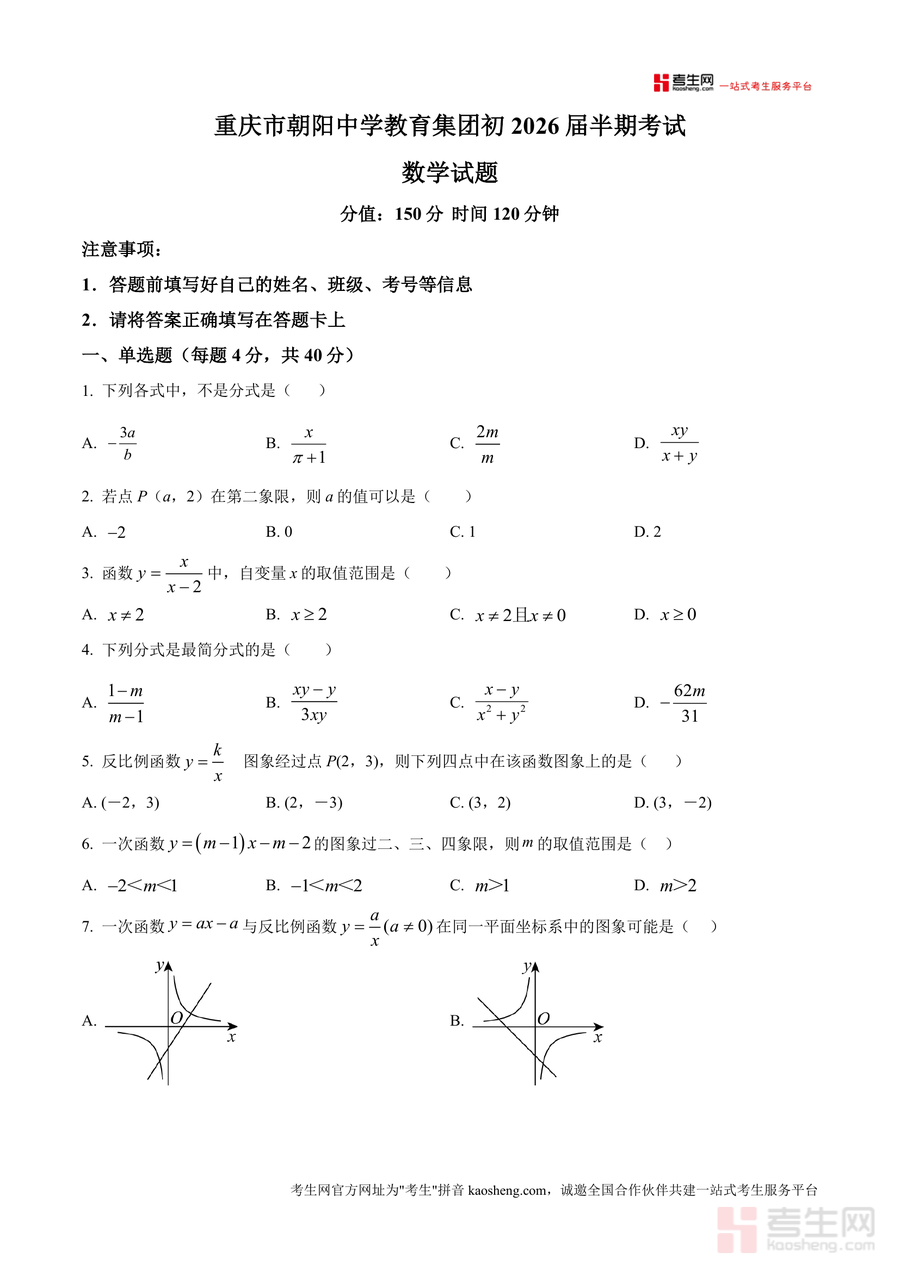 《精品解析:重庆市朝阳中学“教共体”2024-2025学年八年级下学期4月期中考试数学试题(原卷版).docx》是一份面向八年级学生期中备考的权威真题资料。该资料完整呈现朝阳中学教育集团初2026届半期考试数学试题原貌,包含单选题(40分)、填空题(30分)及解答题(80分)三大题型板块,覆盖分式概念判定、反比例函数图象性质、一次函数应用、几何图形面积计算等核心知识点。其特色亮点在于依托教共体教研资源,试题设计贴合重庆本地教学进度与考试要求,能真实反映八年级下学期中期学习成果的考查方向,为备考提供精准参考依据。