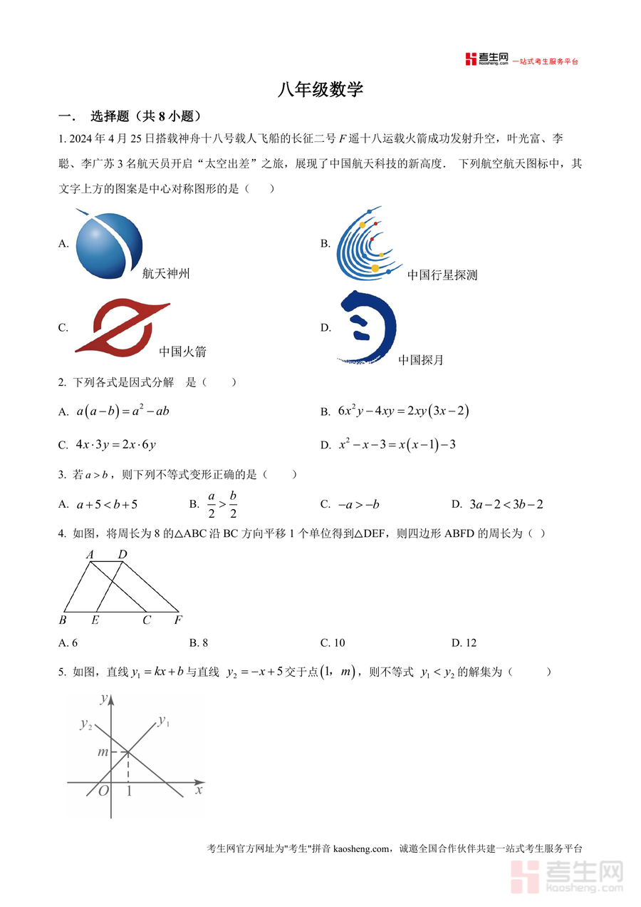 《精品解析:广东省深圳市龙华高级中学观澜校区2024-2025学年下学期八年级期中考试数学试卷(原卷版).docx》是一份针对八年级下学期数学期中备考的精准性资料,核心定位为该校及同区域同类学校学生提供贴合本地教学进度的真题训练载体。资料包含选择题8小题、填空题5小题及解答题7小题三大题型模块,覆盖中心对称图形识别、因式分解、不等式变形规则、几何平移性质、函数图像与不等式解集关联、平行四边形性质与旋转应用等八年级数学核心知识点,特色亮点在于严格遵循该校命题风格与难度梯度设置,题目设计兼顾基础巩固与能力拓展需求。