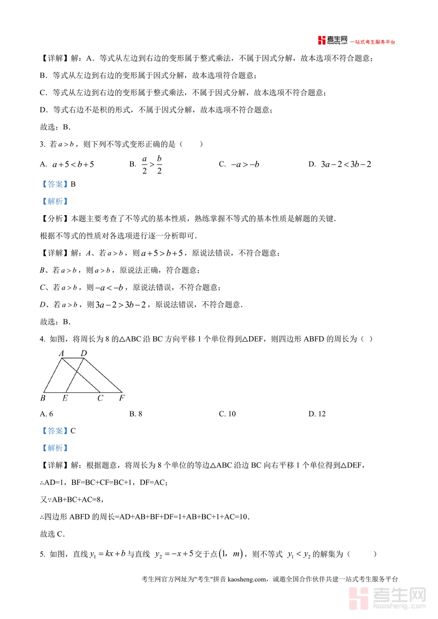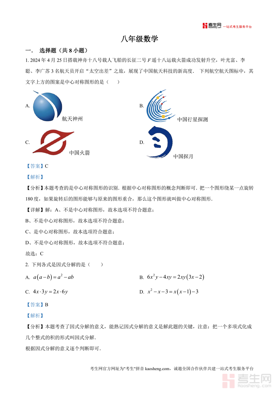 《精品解析:广东省深圳市龙华高级中学观澜校区2024-2025学年下学期八年级期中考试数学试卷(解析版).docx》是一份聚焦该校区八年级学生期中数学备考需求的精准化真题解析资料。文件包含试卷全题型(选择题8小题、填空题5小题、解答题7小题)的深度解析,内容涵盖中心对称图形识别、因式分解、不等式变形等核心考点,并融入神舟十八号航天情境等实际应用案例,每个题目均配备考点分析、规范解答步骤及易错点提示,帮助学生清晰掌握命题逻辑与解题方法。