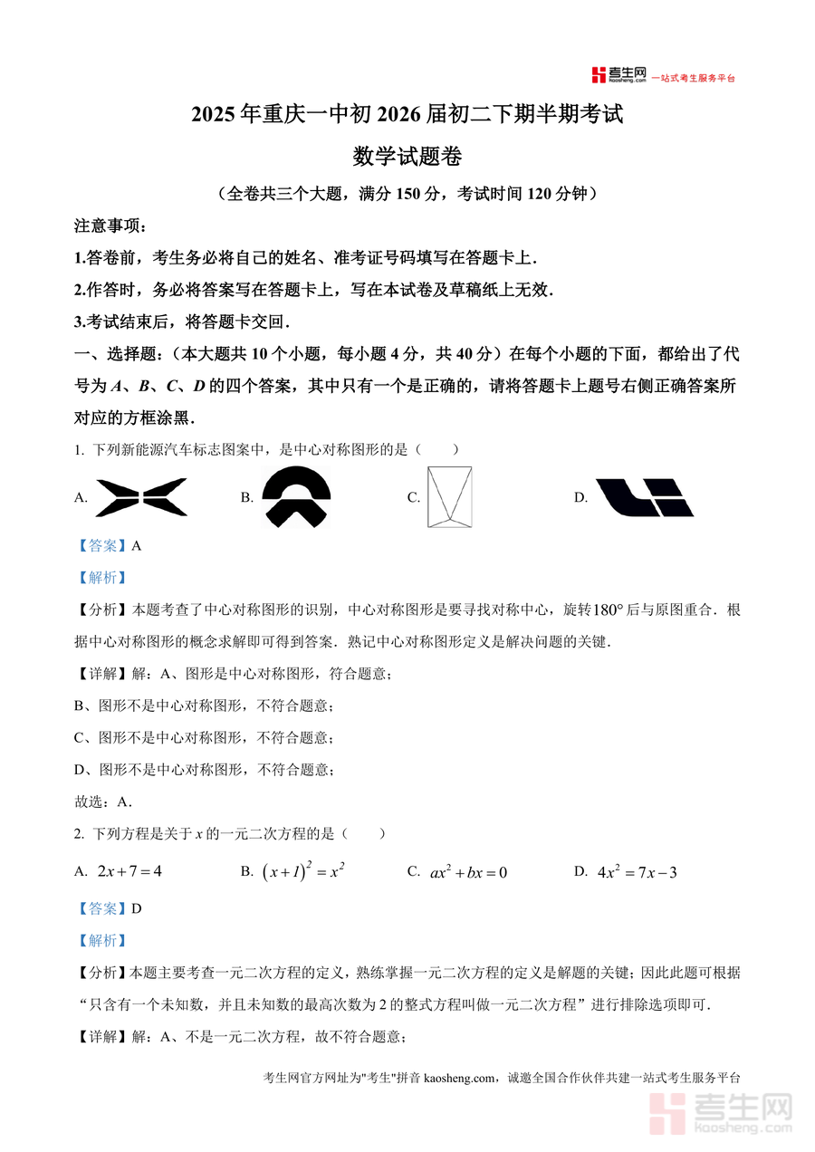 《精品解析:重庆市第一中学校2024-2025学年八年级下学期5月期中数学试题(解析版)》是一份聚焦八年级下学期期中阶段数学核心考点、融合重庆一中命题特色与详细解题指导 的优质备考资料。文件包含完整试题卷及对应解析版内容,试题覆盖中心对称图形识别、一元二次方程定义与根关系、分式性质与运算等八年级下册核心知识点;解析部分针对每道题设置“分析”“详解”“关键提示”模块——如选择题第1题明确中心对称图形判定标准并结合选项验证,第8题整合根与系数关系及判别式应用逻辑,帮助使用者精准把握考点本质。作为真题解析类资料,其既保留试题原真性,又通过分层解析强化知识点迁移能力培养。