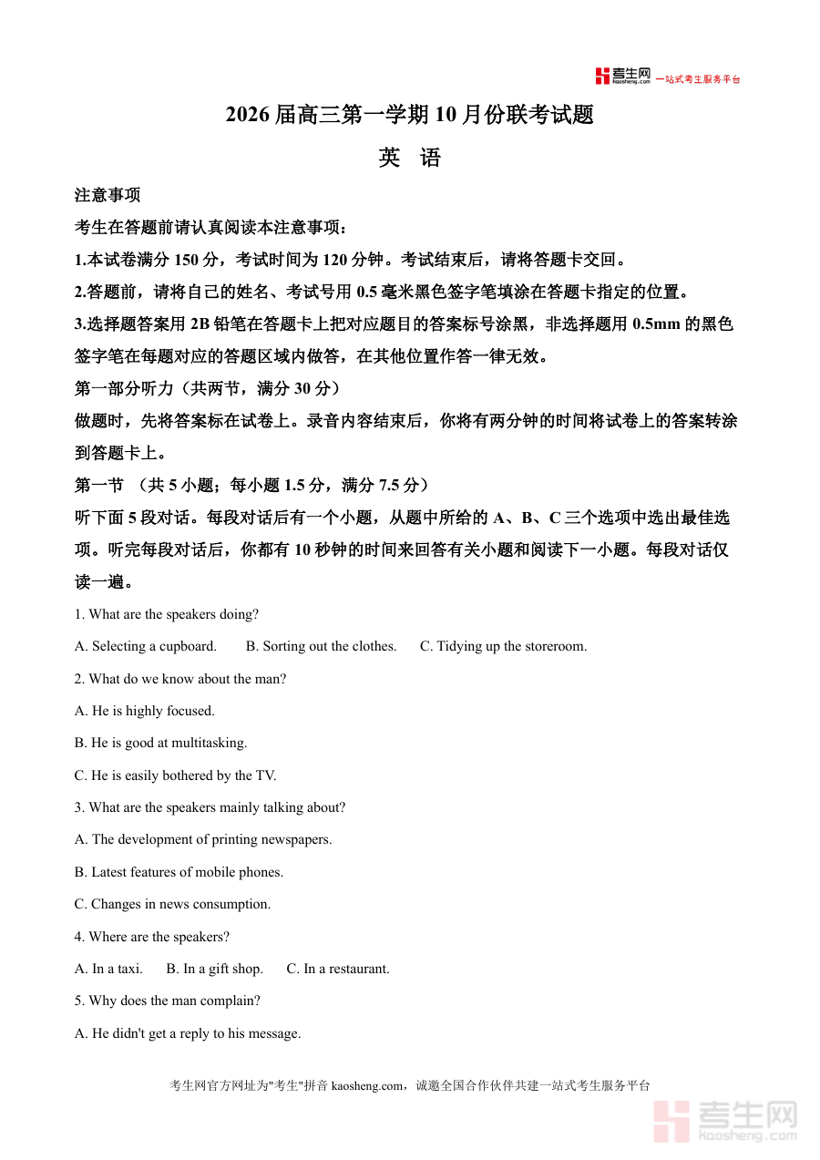 《精品解析:江苏省如东高级中学与沭阳如东中学2025-2026学年高三上学期10月联考英语试题(原卷版)docx》是一份来自江苏省两所知名高中联合命题的高质量高三英语试卷专为2025-2026学年第一学期的高三学生设计试卷涵盖听力阅读等核心板块听力部分包含短对话长对话及独白等题型阅读部分选取多样化主题内容结构与全国高考英语试卷一致确保与官方考核标准对齐其特色亮点在于真实性直接源于顶尖学校的实际教学实践体现其严谨的学术标准和对考试趋势的把握各板块精心设计旨在测试学生的听力理解阅读理解批判性思维等综合语言能力是学生熟悉真实考试场景和难度水平的宝贵资源