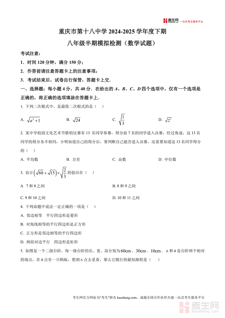 《精品解析:重庆市第十八中学2024-2025学年八年级下学期半期模拟检测数学试题(原卷版)》是一份针对八年级下学期数学半期阶段复习设计的精准备考资料。该试题严格遵循重庆十八中教学进度与命题风格,包含选择题(40分)、填空题(两部分共32分)及解答题(共78分)三大题型,覆盖二次根式化简、一次函数应用、平行四边形与菱形性质、统计量计算、几何最短路径等核心知识点,题型结构与分值分布贴合实际考试要求,能全面反映学生半期学习成果。其特色在于结合该校教学重点设计题目情境,如融入校园文化艺术节、考古探测等实际场景题型,增强试题的实用性与针对性。