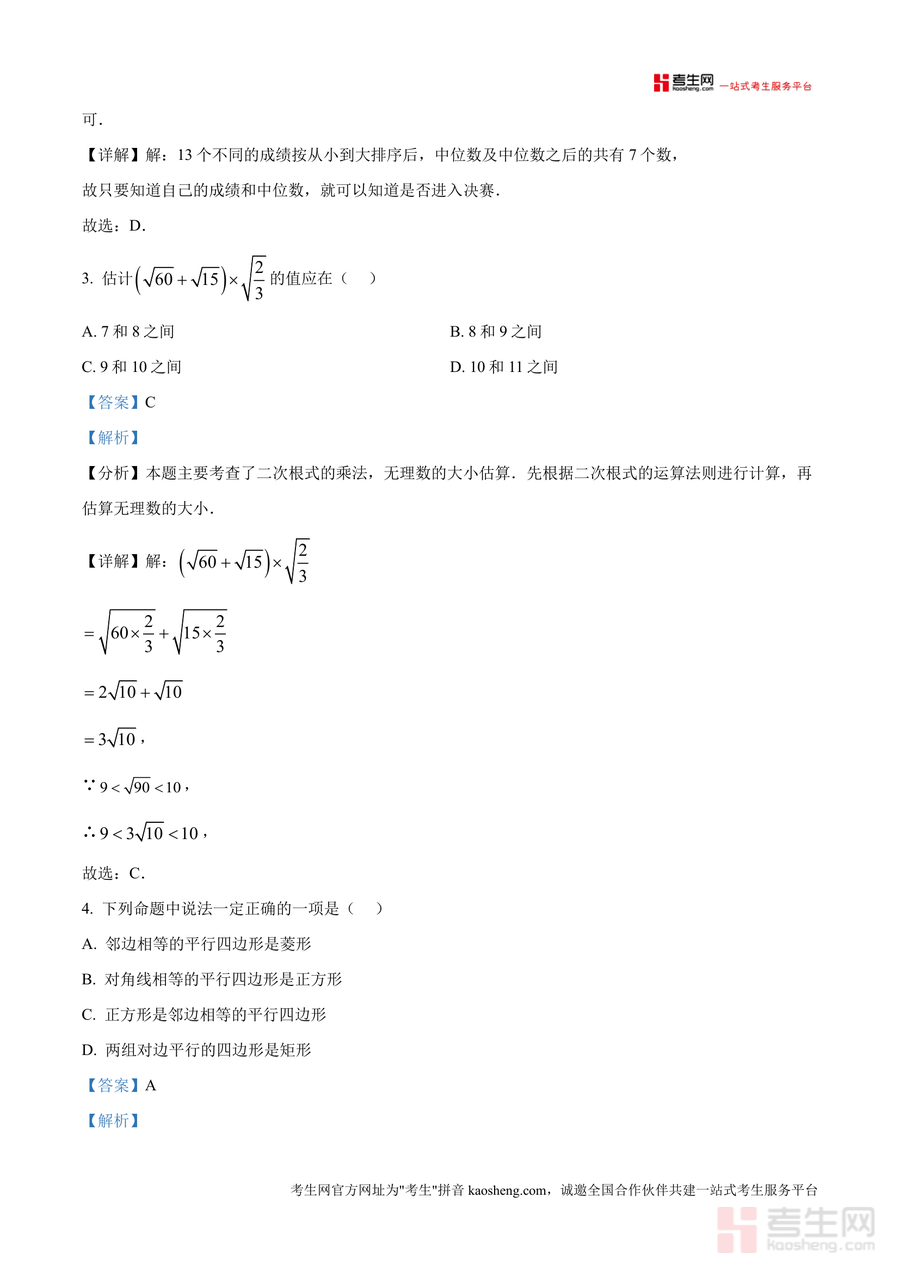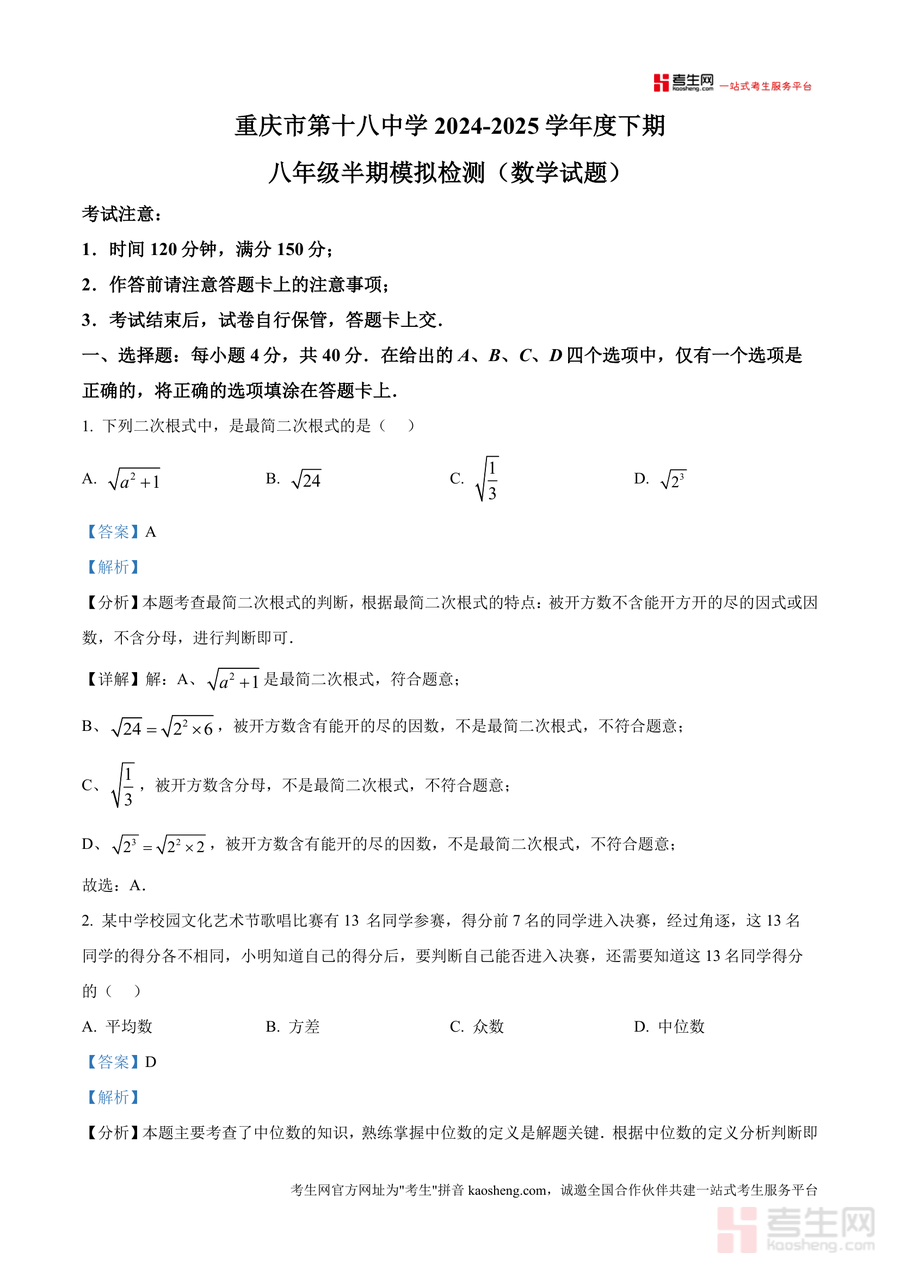 《精品解析:重庆市第十八中学2024-2025学年八年级下学期半期模拟检测数学试题(解析版).docx》是一份针对八年级下学期数学半期考试设计且贴合重庆十八中教学特色 的高质量备考资料。该资料涵盖二次根式、统计量应用、几何图形判定与性质、一次函数及综合几何等核心模块题目,题型包括选择题、填空题(含基础及提升两类)等,全面覆盖半期前重点知识点。其特色亮点在于每道题均配备详实解析:不仅明确考点定位(如最简二次根式判断、中位数统计意义),还包含清晰解题思路推导及规范步骤书写,部分综合题附有关键技巧点睛与易错点提示,助力学生深度理解知识应用逻辑。