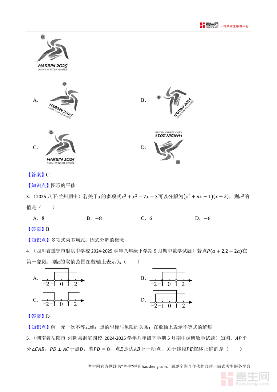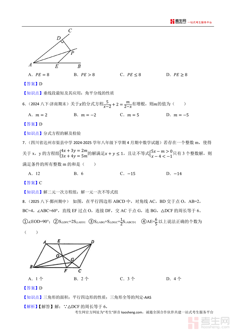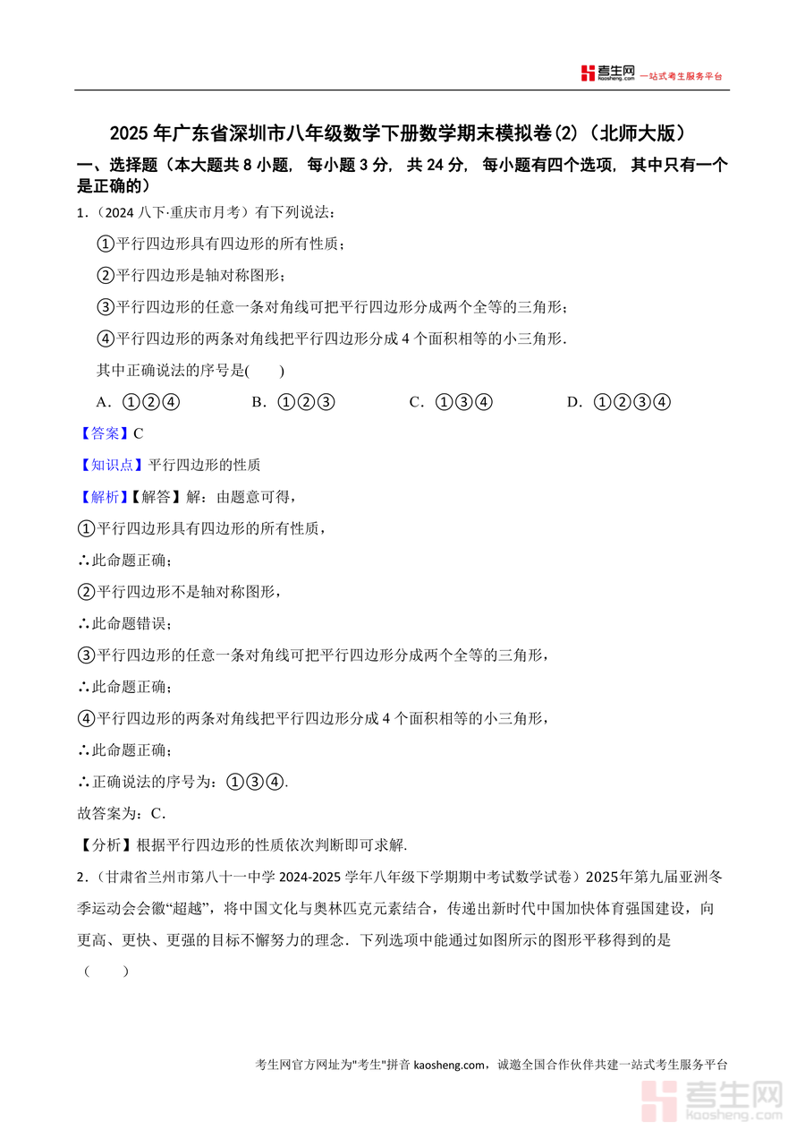 《2025年广东省深圳市八年级数学下册数学期末模拟卷(2)(北师大版)(解析).docx》是一份针对广东省深圳市八年级北师大版数学下册的期末备考资料,涵盖选择题、填空题、解答题三大题型共20道题目(含8道选择、5道填空、7道解答),融合重庆、兰州、深圳本地等多地区近年真题及期中试题改编而成。资料特色在于每道题均配备详细解析,标注核心知识点如平行四边形性质、因式分解综合运用、分式方程解及检验等,并通过图形辅助说明复杂几何问题如平移性质应用、垂线段最短原理等内容,帮助学生理解考点本质及解题逻辑。