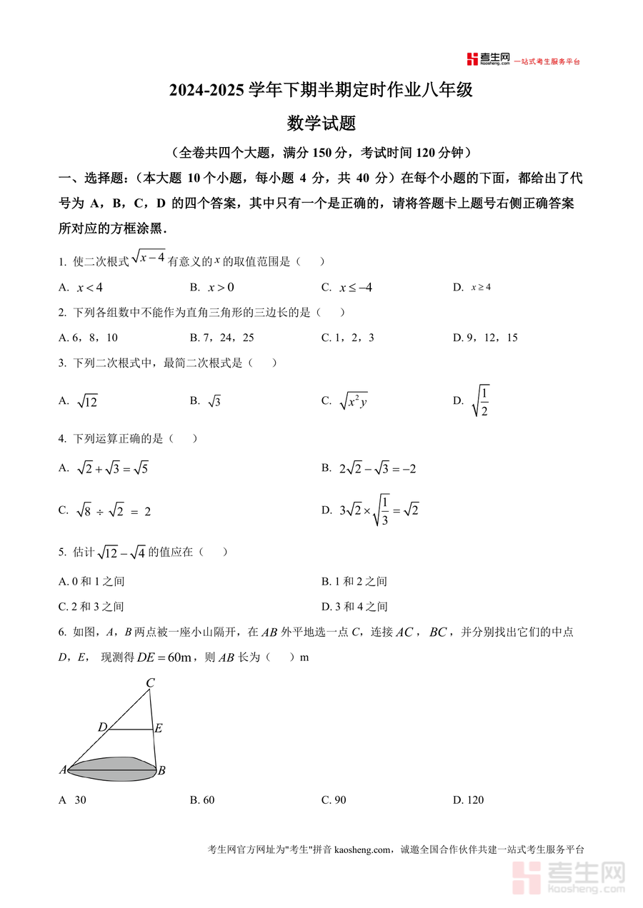 《精品解析:重庆市綦江区联盟校2024-2025学年下学期期中八年级数学试题(原卷版)》是一份面向重庆市綦江区联盟校八年级学生的期中数学考试真题资料。该试卷严格遵循初中数学课程标准要求涵盖二次根式、直角三角形判定与性质、平行四边形及特殊四边形(矩形、菱形、正方形)的性质与判定、坐标几何应用等核心知识点题型包括选择题填空题和解答题三大类全面考查学生对八年级下册数学知识的掌握程度与应用能力试卷结构规范合理题目设置梯度明显既有基础概念题也有综合应用题能有效检验学生的知识储备与解题技巧