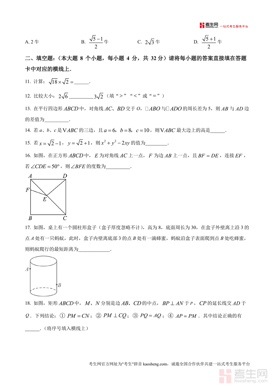 该试卷适用于重庆市綦江区及周边地区的八年级学生初中数学教师以及关注孩子数学学习的家长群体它具有不可替代性作为本地联盟校期中真题其题型设置与知识点分布贴合实际教学进度比通用教辅资料更具针对性长期价值体现在学生可反复练习其中经典题型以巩固核心知识点如二次根式运算几何图形证明培养逻辑思维与解题思路为后续学习及中考奠定坚实基础总之这份试卷是八年级学生期中备考不可或缺的优质资源