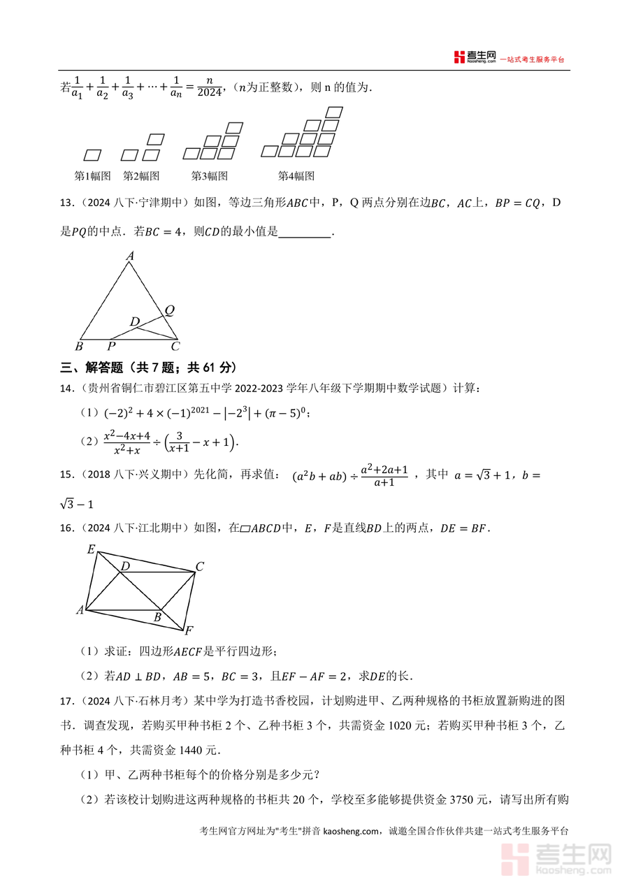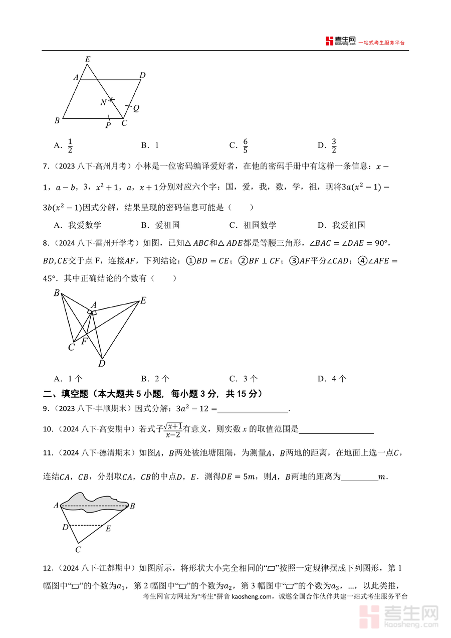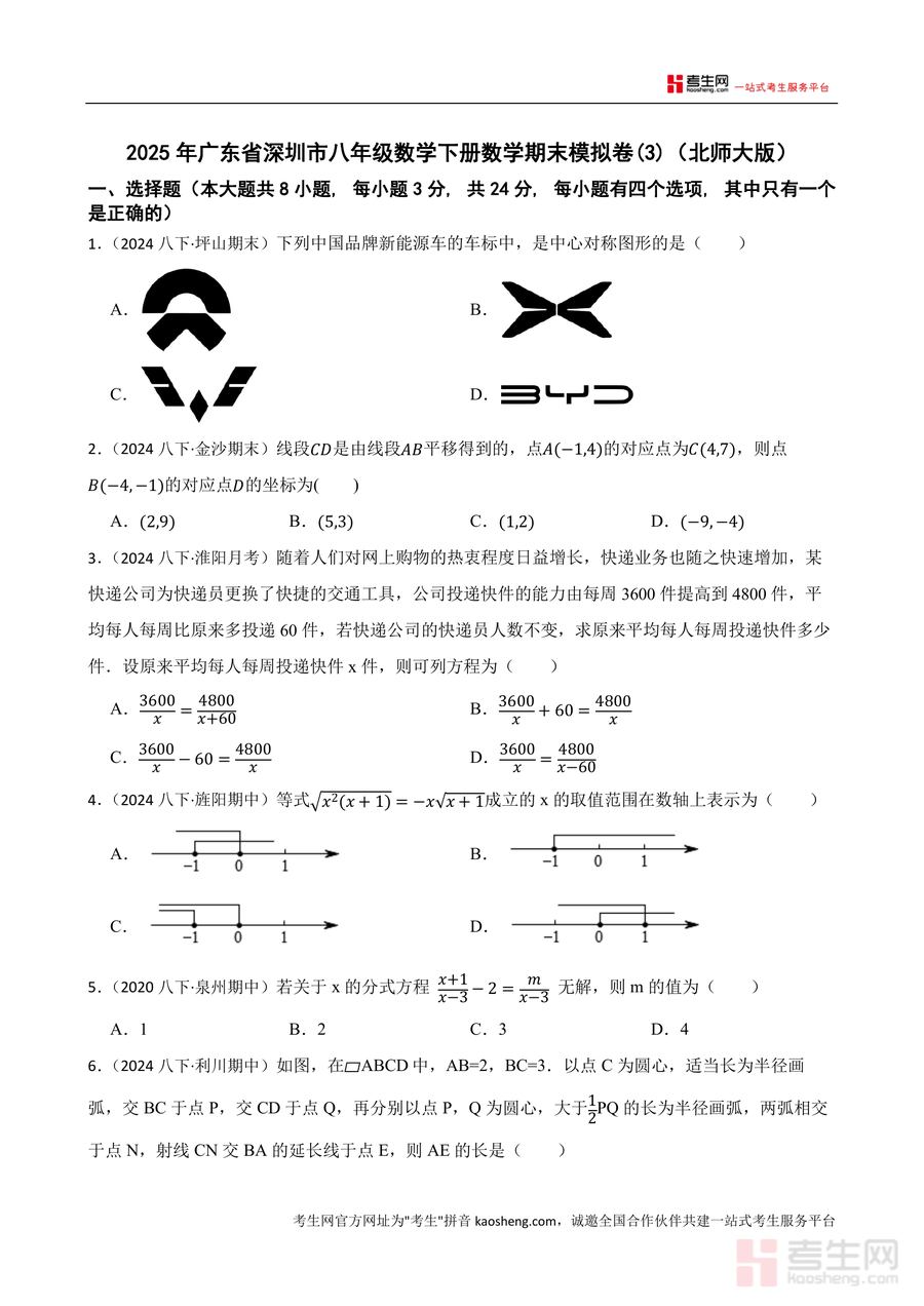 《2025年广东省深圳市八年级数学下册数学期末模拟卷(3)(北师大版)(原卷).docx》是一份贴合深圳市八年级数学期末考纲、适配北师大版教材体系的高质量备考资料。该模拟卷严格遵循深圳本地期末命题结构,包含选择题(8小题共24分)、填空题(5小题共15分)及解答题(7小题共61分)三大题型板块,内容覆盖中心对称图形识别、坐标平移应用、分式方程求解与应用、平行四边形性质与判定、因式分解分组法、三角形中位线定理等北师大版八年级下册核心知识点。其特色在于融合近年深圳坪山、金沙等区域期末真题及周边地区期中典型题改编而成,既保留真题的权威性与针对性,又通过题型重组确保训练效果的全面性,为学生提供贴近本地考情的实战素材。