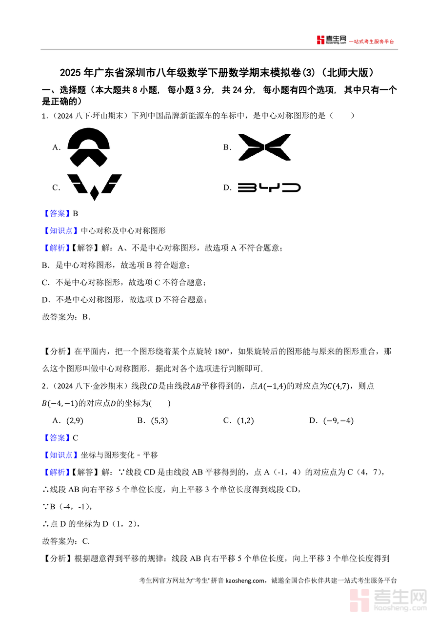 《2025年广东省深圳市八年级数学下册数学期末模拟卷(3)(北师大版)(解析).docx》是一份针对深圳地区八年级北师大版数学下册期末备考设计的模拟卷及配套解析资料。该资料严格遵循深圳本地期末考纲要求构建题型结构——包含8道选择题、5道填空题、7道解答题等完整期末题型;题目精选自2024-2025年深圳坪山、金沙等区域八年级数学下册期末真题改编题,并覆盖中心对称图形、坐标平移、分式方程、平行四边形性质等核心知识点;每道题均配备详尽解析,解析中明确标注考查知识点及解题思路,同时对易错点进行针对性提示。