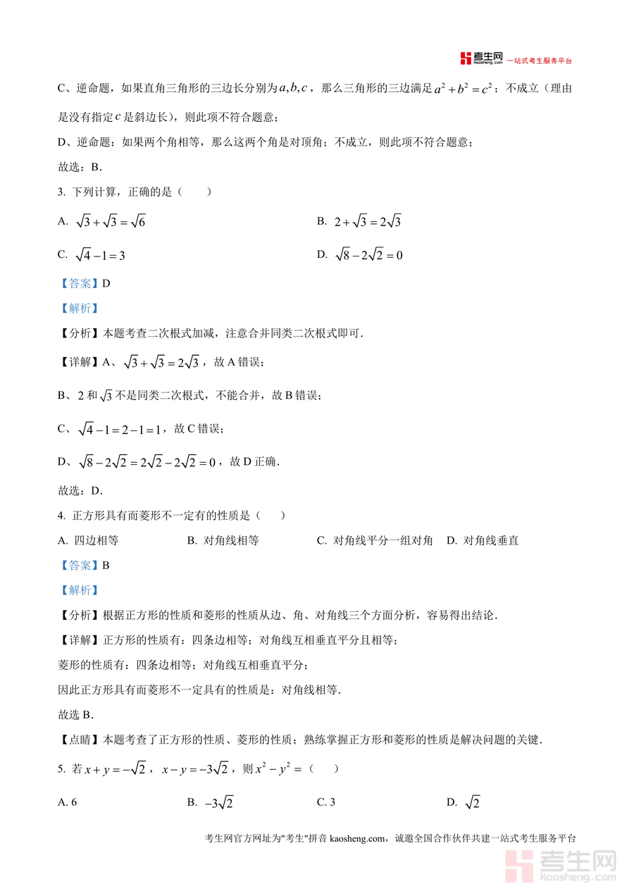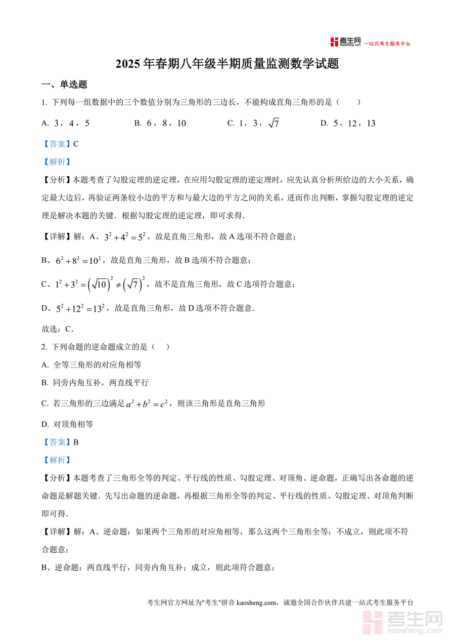 《精品解析:重庆市璧山区四校联考2024-2025学年八年级下学期5月期中数学试题(解析版).docx》是一份针对本地四校联考设计的专业备考资料(核心关键词),聚焦八年级下册数学核心知识点,涵盖勾股定理及其逆定理应用、四边形(菱形/正方形/矩形)性质与判定、分式运算与求值、二次根式化简等模块。资料包含单选题、填空题、解答题全题型覆盖,并对每个题目配备详尽真题解析(核心关键词):不仅明确正确答案,更深入剖析考点定位(如勾股定理逆定理题强调最大边验证步骤)、解题思路(如折叠问题中利用全等转化线段关系)及易错点警示(如分式值为零需同时满足分子为零且分母不为零双重条件),体现专业性与实用性。