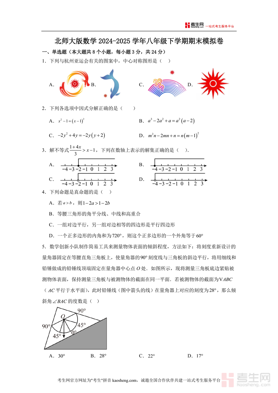 《广东省深圳市2024-2025学年北师大版数学八年级下册期末综合检测卷.docx》是一份针对深圳地区使用北师大版教材八年级学生设计的期末备考核心资料,涵盖单选题(8道)、填空题(5道)、解答题(7道)等完整题型结构,包含跨学科组合题、几何作图题及拓展探究题等特色题型,并附详细参考答案与考点分析。其内容严格贴合深圳本地期末考纲要求,突出中心对称图形识别、因式分解、不等式求解等核心知识点,融入杭州亚运会图案判断、交通路线规划等真实情境案例,增强试题实用性与情境性。