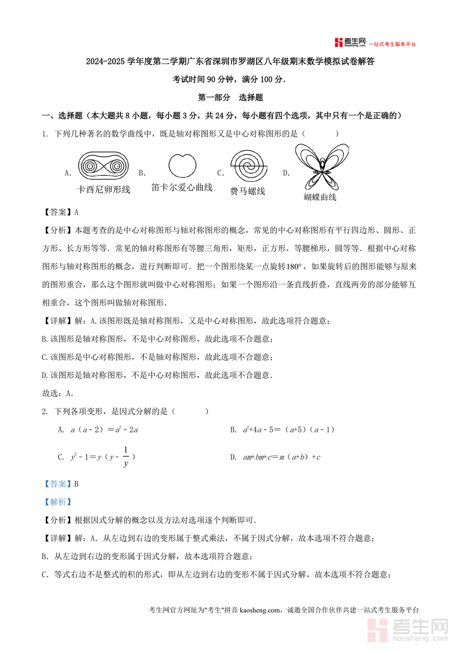 《2024-2025学年度第二学期广东省深圳市罗湖区八年级期末数学模拟试卷解答.docx》是一份针对深圳罗湖区八年级数学期末备考设计的专业真题解析资料。该资料严格遵循本地考纲要求,涵盖考试时间90分钟、满分100分的完整试卷结构,包含8道选择题、5道填空题及7道解答题;每道题均配备详细分析(如中心对称与轴对称概念辨析、因式分解方法应用)、步骤化详解及易错点睛(如分式方程增根处理技巧),深度覆盖几何变换、代数运算、实际应用等核心考点,突出本地化题型特点与解题思路引导。