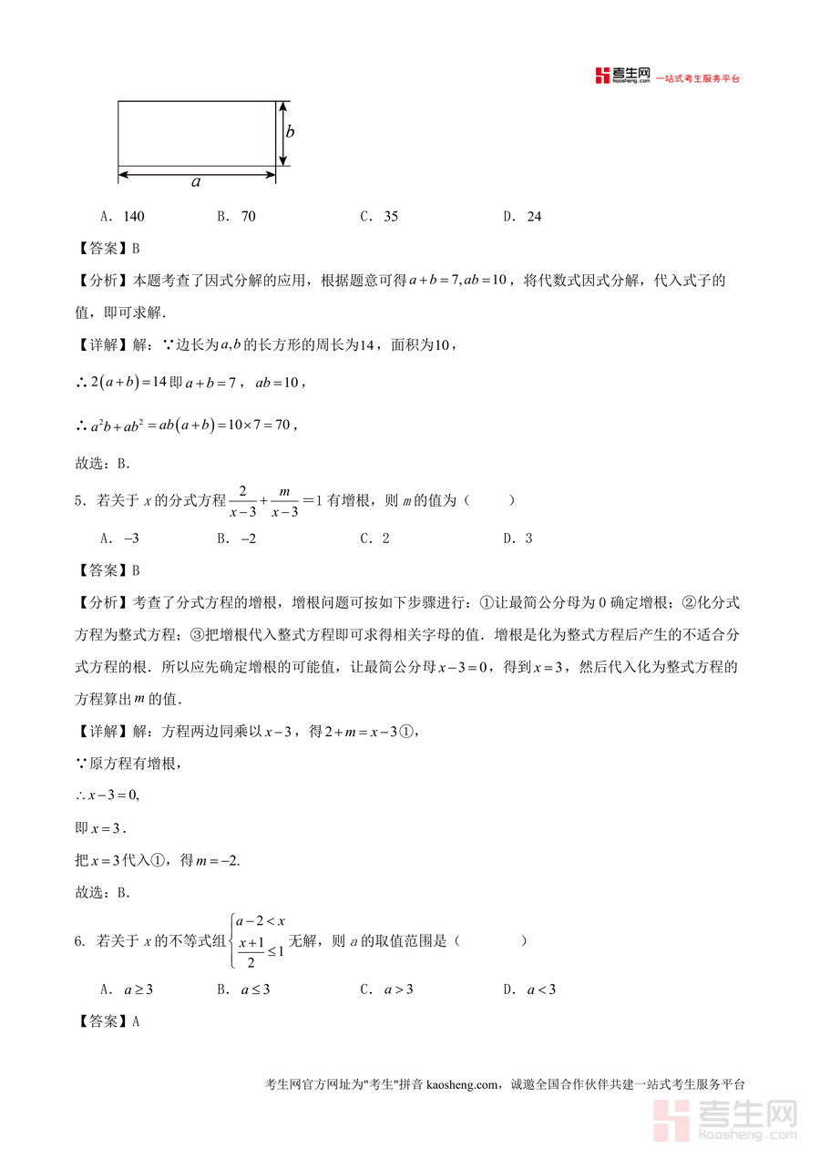 该资料核心用途在于帮助学生系统梳理期末考点,通过对照解析掌握不同题型解题逻辑;使用场景包括学生自主刷题后的错题复盘(如通过不等式组无解条件判断总结知识盲区)、教师课堂例题讲解或作业设计参考;用户价值体现在有效提升应试能力——如解析中融入解题策略(如分式方程应用问题建模方法),助力学生快速掌握考点技巧;备考优势则在于本地化题型设计与详细解题步骤结合,让复习更具针对性与高效性。