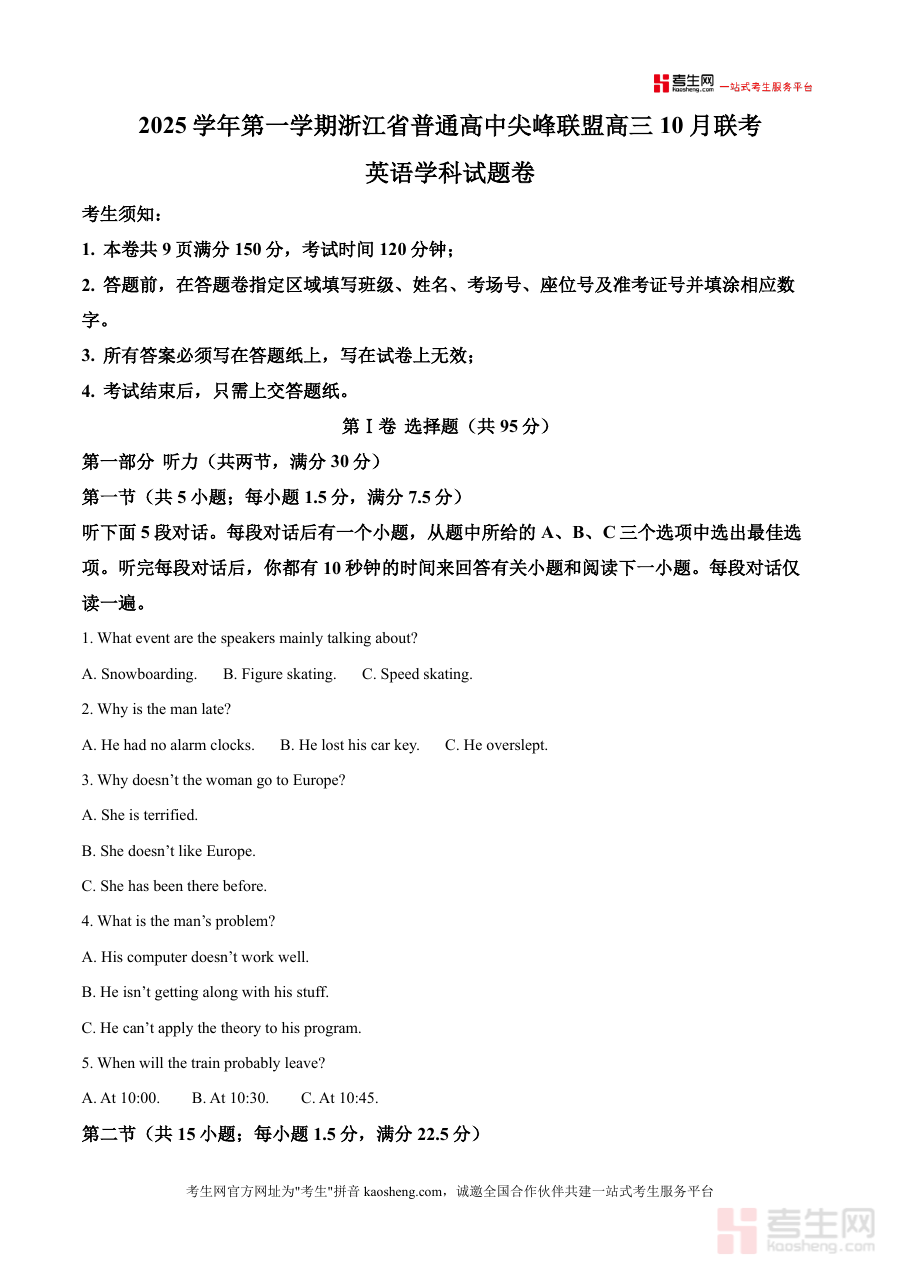 《精品解析:浙江省普通高中尖峰联盟2025-2026学年高三上学期10月联考英语试题(解析版)》是一份针对浙江省高三学生打造的高品质备考资料,整合了尖峰联盟联考这一省内权威考试的最新题型与命题趋势。该资料完整呈现了本次联考的英语试卷内容(包括听力、阅读理解、完形填空等全题型)及配套详尽解析,其核心特色在于每道题目均配备深度分步式解答:不仅明确给出正确答案,还系统分析错误选项的设置逻辑与常见误区,梳理题目涉及的核心词汇、固定搭配及语法知识点,并提供适配不同题型的实用解题策略(如听力中的关键词定位法、阅读理解中的主旨归纳技巧)。这种全方位解析模式帮助学生掌握同类题目的解题思路,实现从“知其然”到“知其所以然”的认知升级,是真题解析类资料中的标杆性选择。