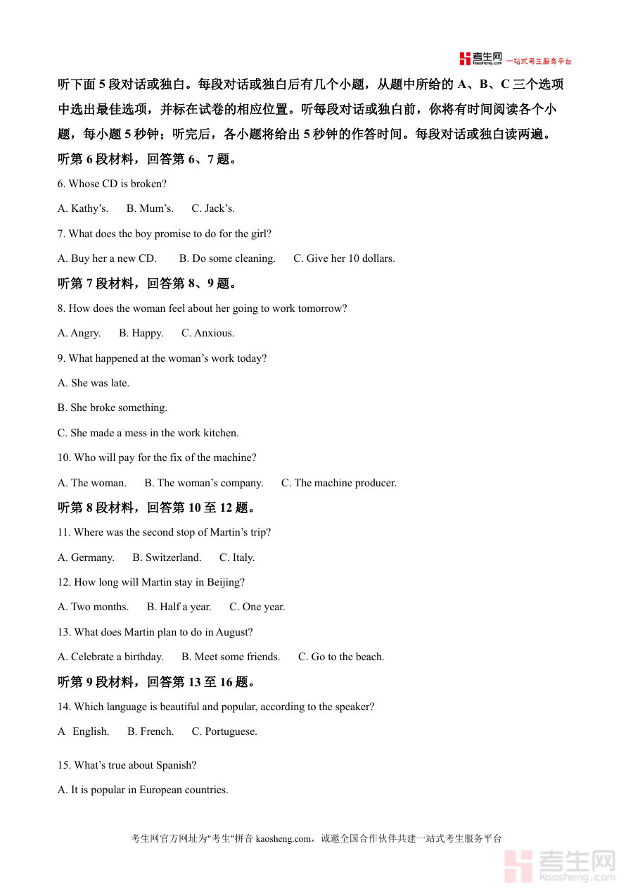 该资料的核心用途覆盖多场景需求:学生可通过模拟真实考试环境完成整套试卷,提升应试能力与时间管理技巧;教师可借助其权威内容设计课堂专题复习或针对性训练;辅导者则能依据解析中的重点难点为学生制定个性化提升方案。其用户价值体现在精准助力学生定位薄弱环节——例如听力部分的信息捕捉能力不足、阅读理解中的推理判断失误等,并通过系统解析强化知识体系:在听力部分,解析会标注对话中的关键信息词与语气提示;在阅读部分,则会拆解文章结构与作者观点,帮助学生学会高效提取信息与逻辑分析。这些内容显著提升备考效率,让学生在有限时间内获得最大化进步。