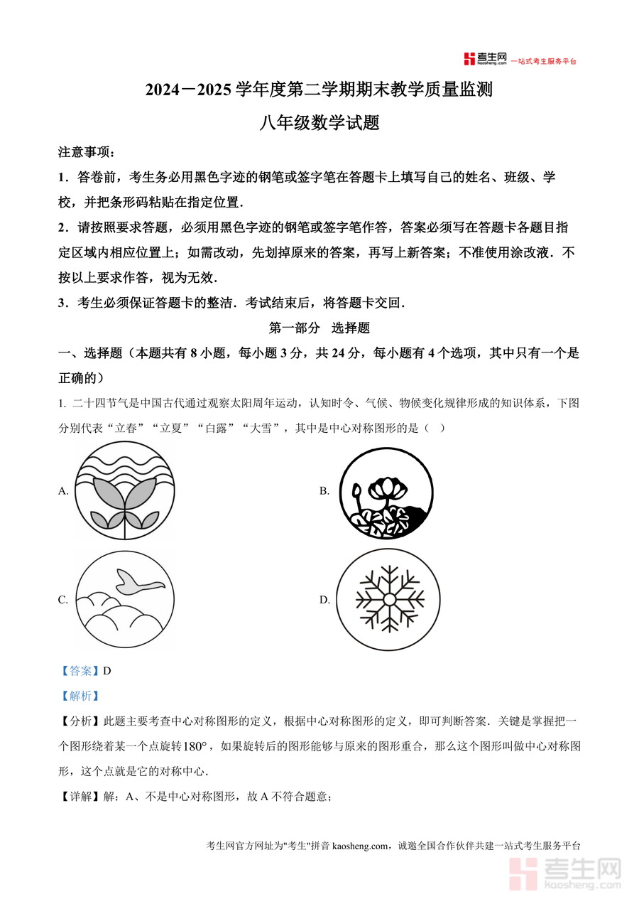 《精品解析:广东省深圳市南山区2024-2025学年八年级下学期数学期末试卷(解析版).docx》是一份聚焦南山区八年级数学期末考情、整合完整真题与深度解析核心考点内容备考资料。文件包含选择题(24分)、填空题(15分)及解答题(61分)三大板块,覆盖中心对称图形判断、不等式性质应用、分式方程求解等基础题型,也涵盖平行四边形判定、"智慧数"新定义等重难点;解析部分标注考点出处及易错提示,如角平分线作图性质应用步骤拆解,帮助学生把握命题方向与解题逻辑。