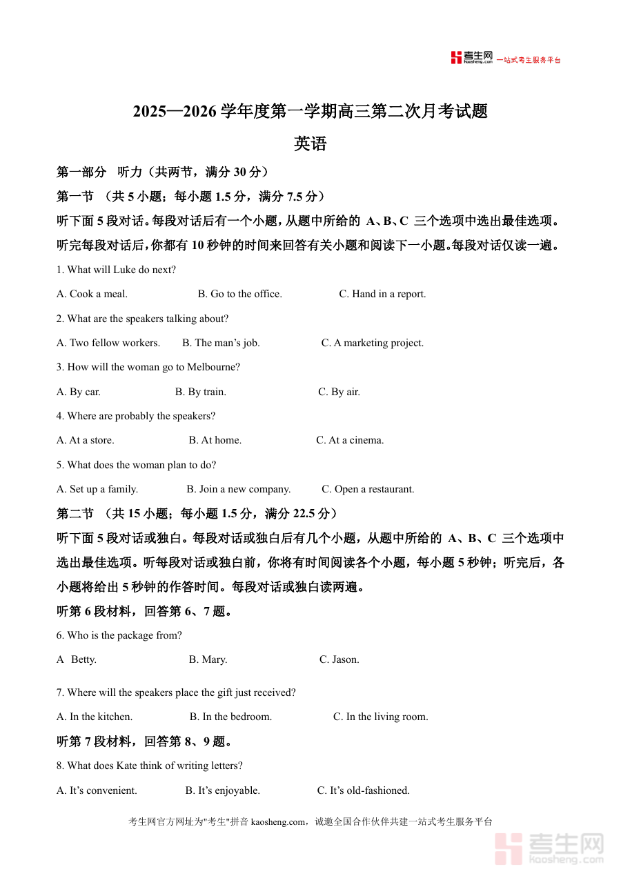 《精品解析:海南省文昌中学2025-2026学年高三上学期第二次月考英语试题(原卷版)》是一份针对高三学生英语学科能力评估与备考训练的标准化校考真题资料。该资料完整呈现了本次月考的原卷内容,涵盖听力(两节共30分)、阅读理解(两节共50分)等核心题型,题型设置与高考英语试卷结构高度契合,包括短对话理解、长对话及独白听力、多篇阅读理解等,全面考查学生的听力理解、信息提取、逻辑推理及语言应用能力。其特色亮点在于依托文昌中学的教学实践经验,题目选材贴近学生生活实际与学科热点,兼具区域性教学特色与全国高考命题趋势,为学生提供了真实且具有针对性的练习素材。