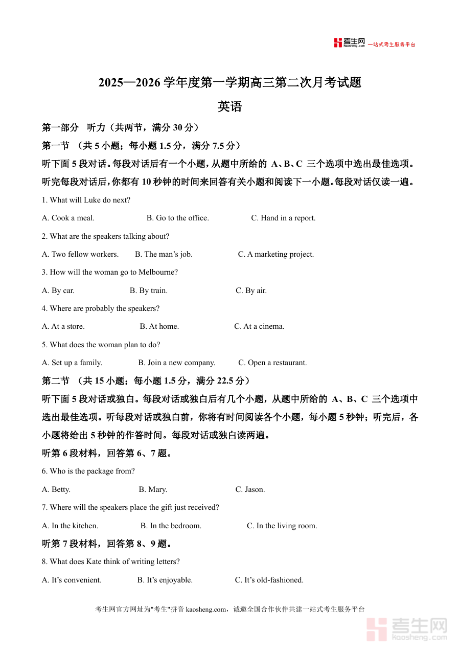 本资料适用于高三学生日常备考训练、月考后针对性复盘以及教师教学辅助等场景。学生可通过对照解析掌握听力中的关键信息捕捉技巧、阅读理解中的文本逻辑分析方法,清晰定位自身知识薄弱环节与解题思维误区;教师则能借助其详尽的考点拆解与错误归因,优化课堂讲解内容与习题设计方案。其备考优势在于以真实月考真题为依托,还原考试实际情境,帮助使用者熟悉题型结构与命题风格,有效提升应试能力与答题速度。