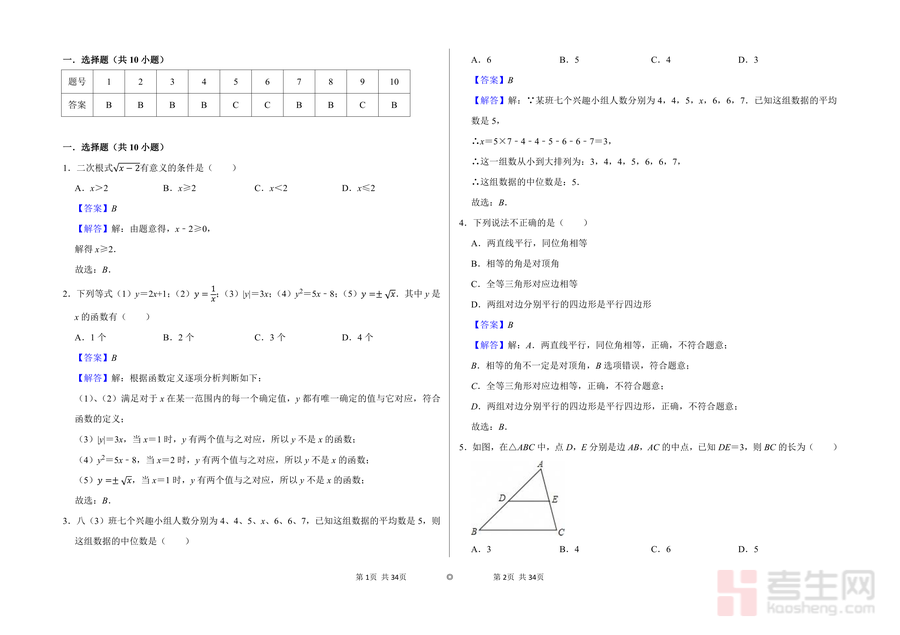 《2024———2025学年教育质量全面监测(中学)八年级(下)数学试题(模拟二)答案.pdf》是一份针对八年级下学期数学模拟测试的配套权威参考答案文件,核心定位为辅助学生巩固知识、提升解题能力的备考资料。文件涵盖选择题(共10小题)、填空题(共6小题)等题型完整解答内容,覆盖二次根式有意义条件、函数定义判定、中位数计算、几何图形性质(菱形对角线与面积关系、正方形中点连线问题等)、不等式组整数解分析、分式方程求解等八年级下册数学核心知识点。其特色亮点在于每个题目均配备规范且详细解答步骤,不仅给出正确选项或答案,并通过逻辑推导过程帮助使用者理解解题思路,同时融入教育质量监测命题导向确保内容专业性与实用性。