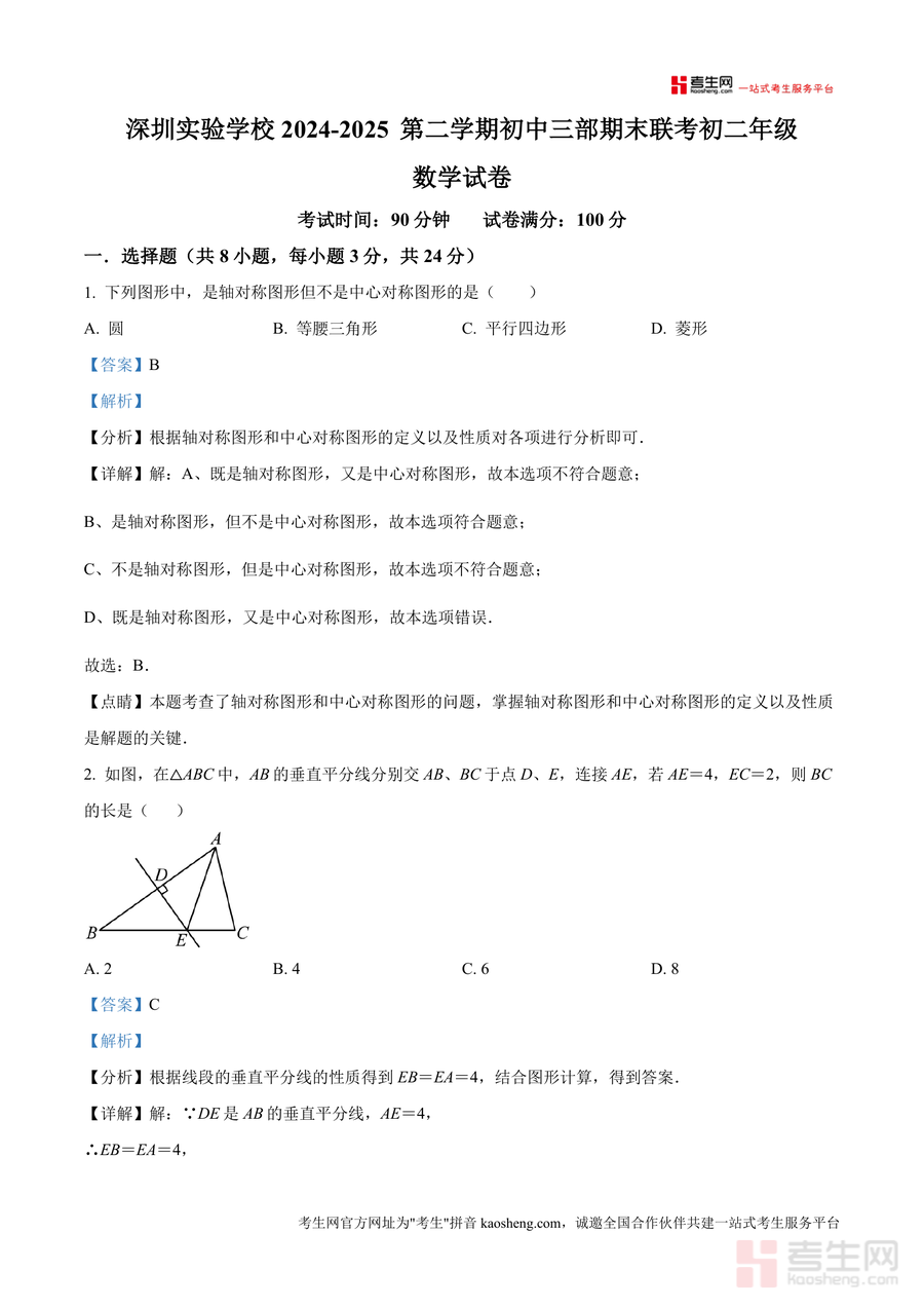 《精品解析:广东省深圳实验学校2024-2025学年下学期期末考试八年级数学试卷(解析版).docx》是一份针对深圳实验学校八年级数学期末考编写专业备考资料,包含完整试卷内容及每道题目的深度解析。资料覆盖8道选择题、5道填空题及7道解答题,每道题均配备考点定位、分步解题过程与易错点提示,如对轴对称图形判定、线段垂直平分线性质等核心考点的解析,既夯实基础又拓展思维,助力学生构建清晰知识体系。