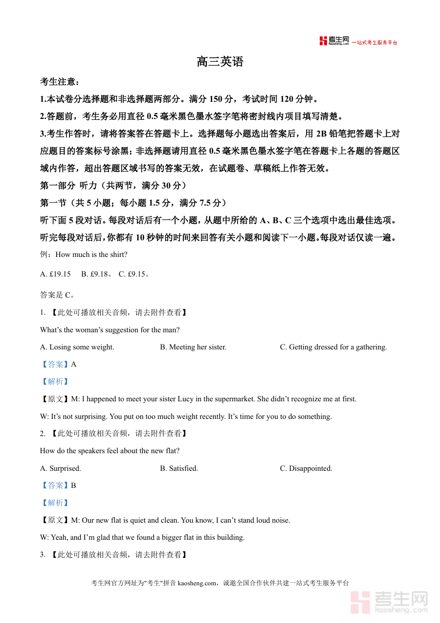 《精品解析:甘肃省多校2025-2026学年高三上学期第二次联考英语试卷(解析版).docx》是一份针对甘肃省多校高三学生的高质量备考资料,聚焦英语学科的核心考点与应试能力提升。该资料包含完整的联考英语试卷内容及详尽解析,覆盖听力、阅读、写作等关键模块(本次片段展示听力部分),其中听力板块不仅提供题目及选项,还附带原文对话转录与精准的答案解析,帮助学生深入理解题目设置逻辑与解题思路。其特色亮点在于解析的专业性与实用性,通过逐题拆解考点、分析易错点,并结合语境讲解词汇与语法应用,为学生搭建清晰的知识框架,助力其掌握应试技巧。