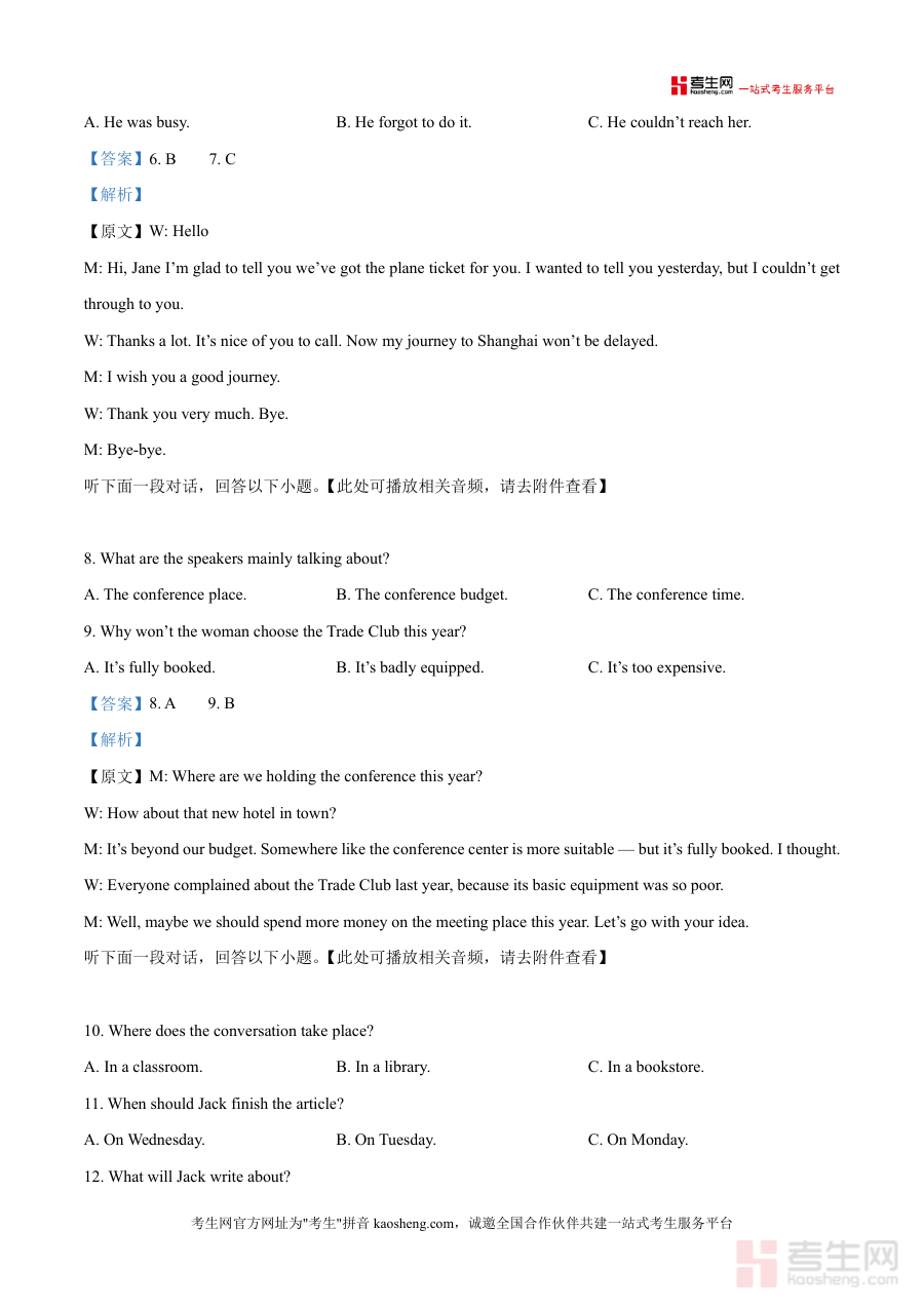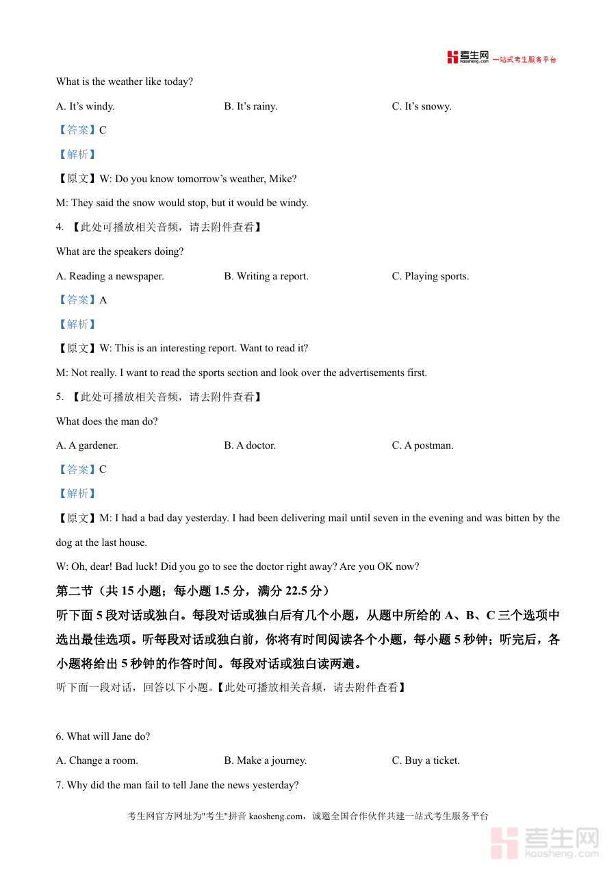这份真题解析的核心用途在于辅助学生进行高效备考,适用于日常自我检测、课堂同步复习及考前模拟训练等场景。学生可通过模拟真实考试环境完成试卷,提升时间管理能力与应试技巧;同时,借助详细的解析内容,能够快速定位知识漏洞,针对性强化薄弱环节如听力理解中的细节捕捉能力。对于教师而言,该资料可作为教学参考素材,帮助设计针对性的训练方案,提升课堂教学效率。其备考优势体现在贴合本地联考命题趋势,能够让学生提前熟悉考试题型与难度分布,增强应试信心和实战能力。