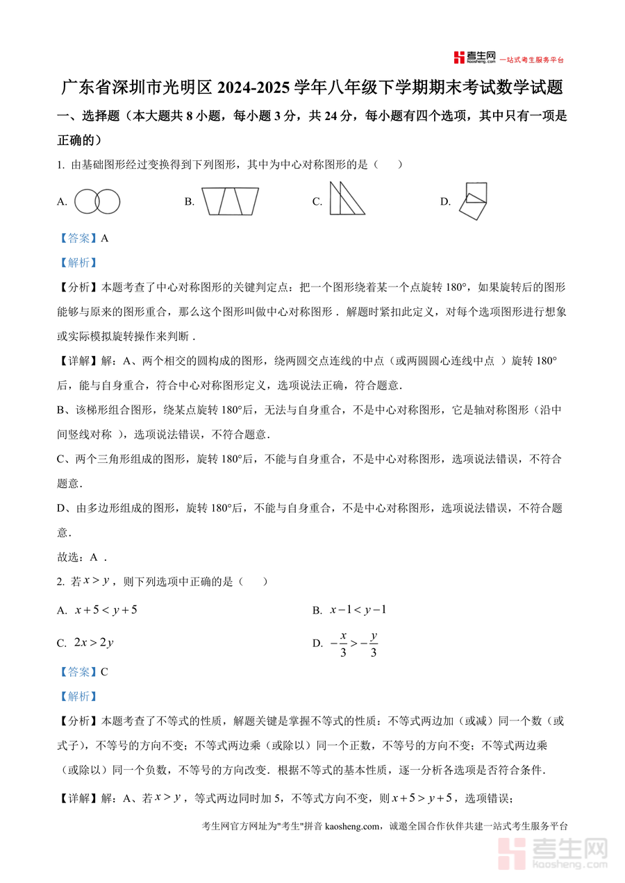 《精品解析:广东省深圳市光明区2024-2025学年八年级下学期期末考试数学试题(解析版)》是一份聚焦深圳市光明区八年级下学期数学期末考真题编制的专业备考资料。资料涵盖完整试题及逐题深度解析内容,覆盖选择题、填空题、解答题三大核心题型,每道题均包含考点定位、详细解答步骤及易错点警示,如对中心对称图形判定、不等式性质应用等基础考点进行精准拆解,对平行四边形性质证明、分式方程求解等综合题型提供逻辑清晰推导过程。其特色亮点在于严格遵循光明区本地教学大纲与考情趋势,解析过程兼顾知识巩固与思维方法培养,助力学生掌握核心考点与解题技巧。