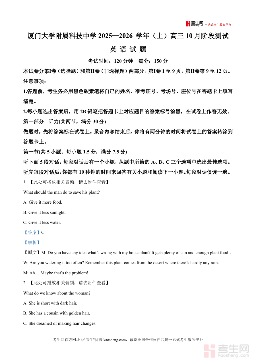 《精品解析:福建省厦门市科技中学2025-2026学年高三上学期10月月考英语试题(解析版)》是一份针对高三学生英语学科阶段性检测的专业备考资料,包含完整试题及详尽解析内容。该资料以厦门大学附属科技中学2025-2026学年高三上学期10月月考英语试卷为基础,覆盖听力、阅读、写作等核心题型,每道题目均配有准确答案及深度解析——不仅呈现原文内容,还剖析选项设计逻辑、解题思路及常见误区。其特色亮点在于结合该校教学特色与高考命题趋势,将真题解析与能力提升有机结合,帮助学生精准把握考点方向。