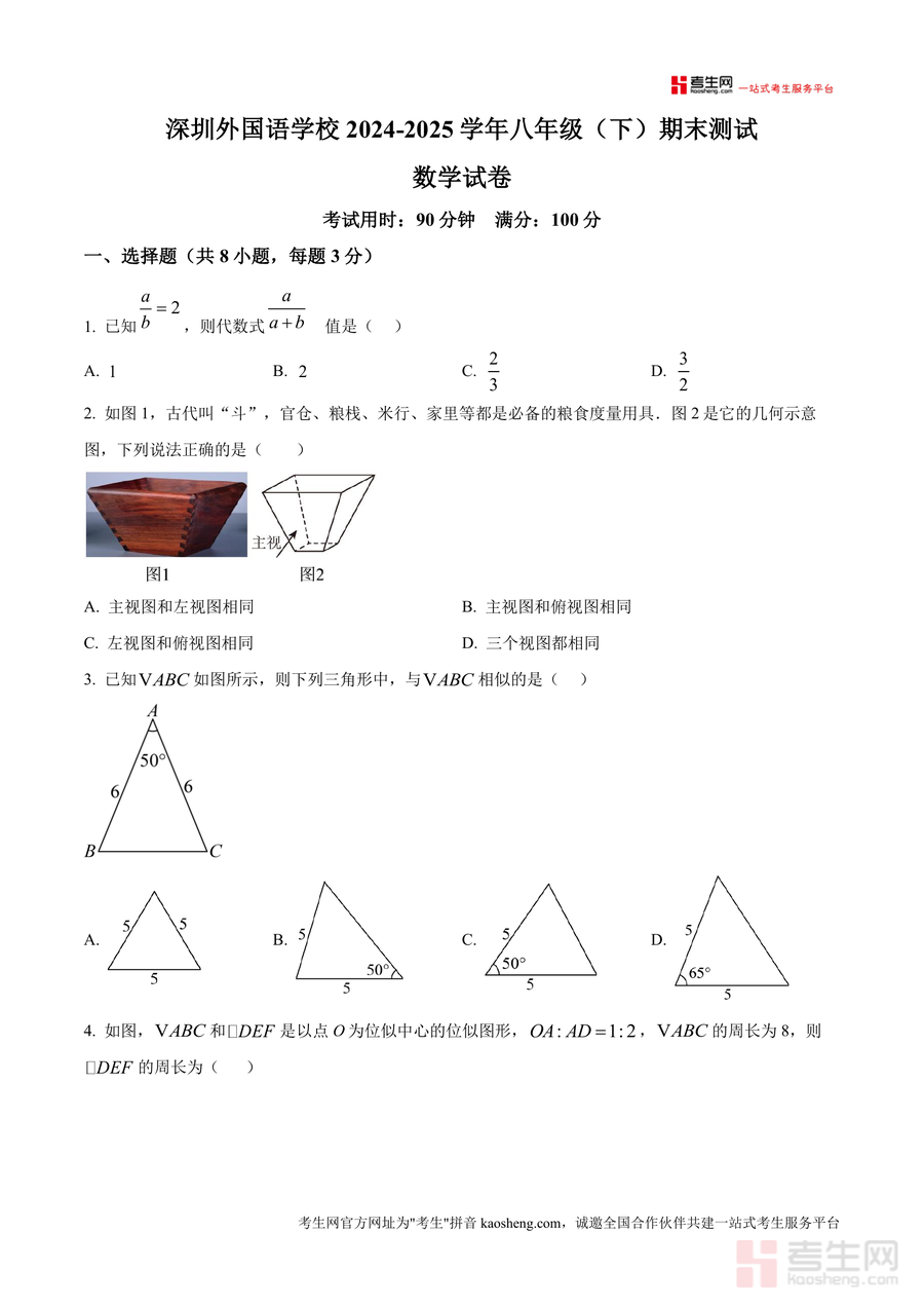《精品解析:广东省深圳市深圳外国语学校2024-2025学年八年级下学期期末数学试卷(原卷版)》是一份针对深圳外国语学校八年级学生期末数学考查设计的权威备考资料。该试卷严格遵循深外教学大纲与期末命题规律,内容覆盖八年级下册数学核心模块——包括二次函数与方程、相似三角形及位似图形、反比例函数应用、几何三视图分析、概率统计及综合应用题等,题型设置与深外期末考完全一致:8道选择题(每题3分)、5道填空题(每题3分)、7道解答题(含配方法解方程、几何证明、函数综合等),并保留原卷考试时长(90分钟)与分值分布(满分100分)。其特色亮点在于贴合深外教学进度与命题风格,能真实还原该校期末考场景。