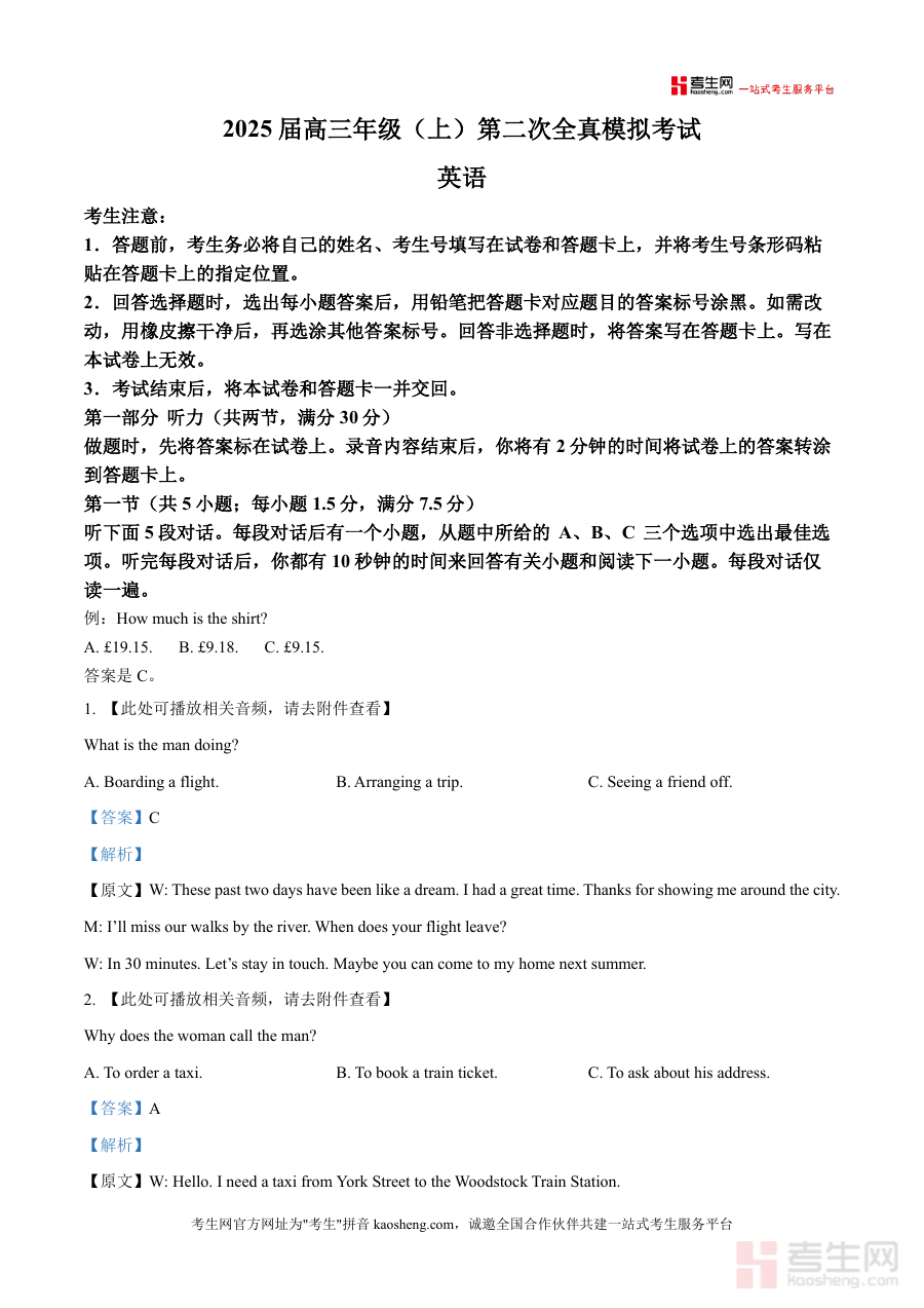 《精品解析:贵州省遵义市第四中学2025-2026学年高三上学期第二次全真模拟考试英语(解析版)》是一份针对高三学生英语高考备考的专业真题解析资料,涵盖听力、单选、阅读等完整考试模块,严格遵循高考英语命题规律与题型结构。资料不仅包含完整的考试题目(如听力部分的对话原文及选项设计),更提供详尽的答案解析,包括听力原文的逐句呈现、题目考点分析及错误选项排除逻辑,帮助学生精准把握命题意图与解题思路。其特色亮点在于全真模拟考试场景的设计,从答题规范提示到题型分布比例均与高考一致,同时解析内容融入了应试技巧指导,为学生提供沉浸式备考体验。
