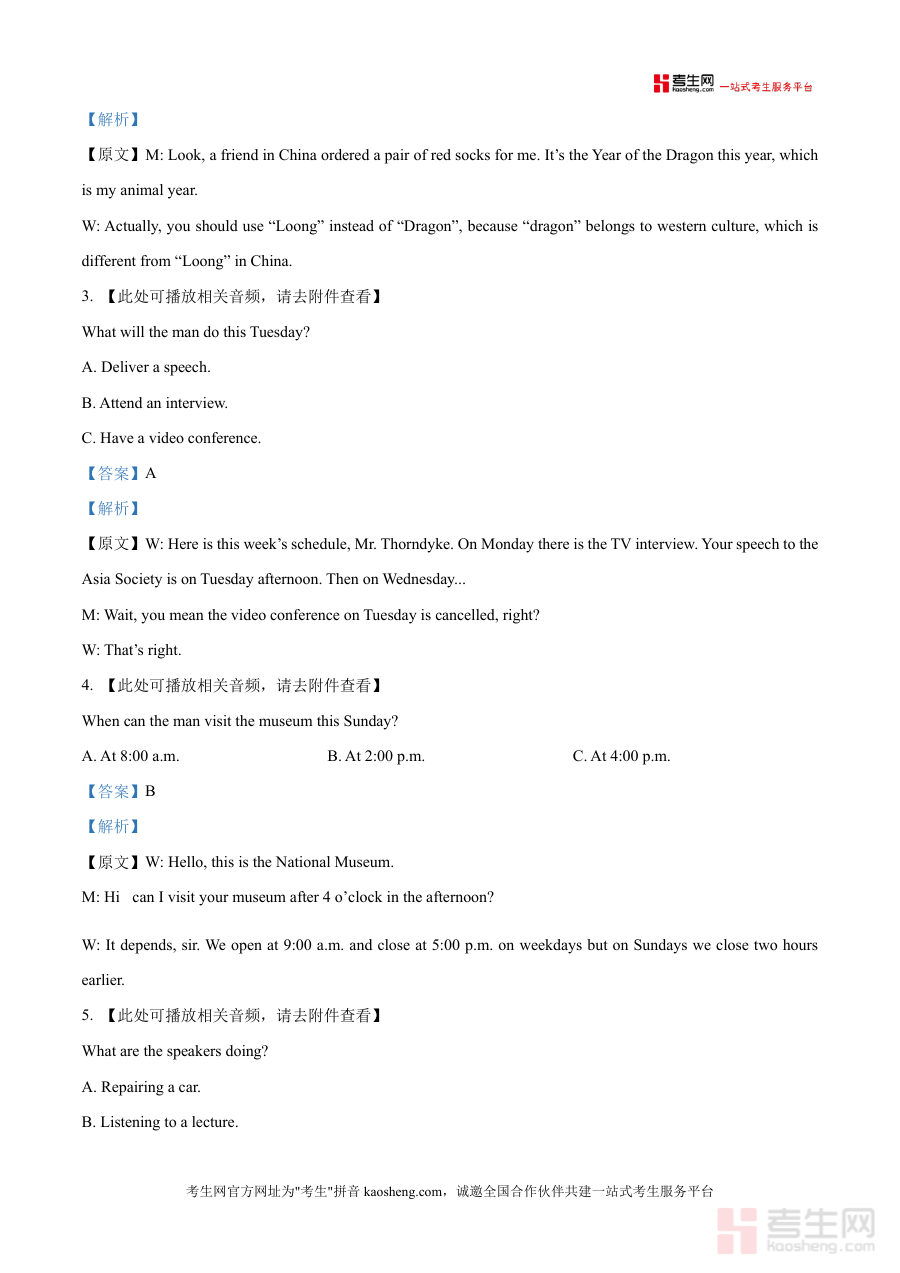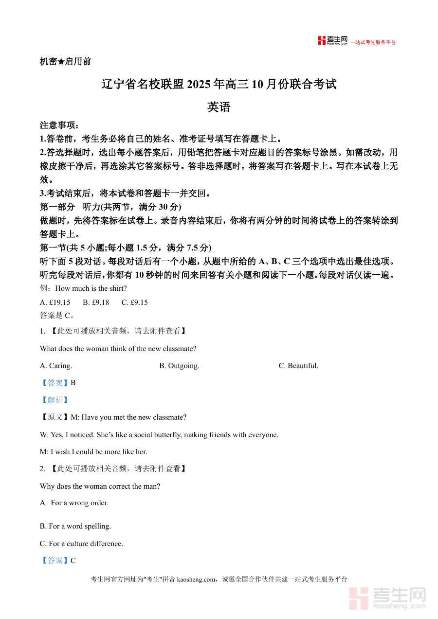 《精品解析:辽宁名校联盟2025-2026学年高三上学期10月联考英语试题(解析版)》是一份针对辽宁地区高三学生英语备考的专业真题解析资料,核心定位为辅助学生掌握联考命题规律与提升应试能力的权威工具。文件涵盖听力(含两节共20小题)等全题型内容,特色亮点在于逐题呈现完整听力原文、准确答案及深度解析:例如针对文化差异类题目(如“Loong”与“Dragon”的区分)补充背景知识,针对社交互动、日程安排等场景归纳听力高频考点,帮助学生理解命题意图与解题逻辑关联。