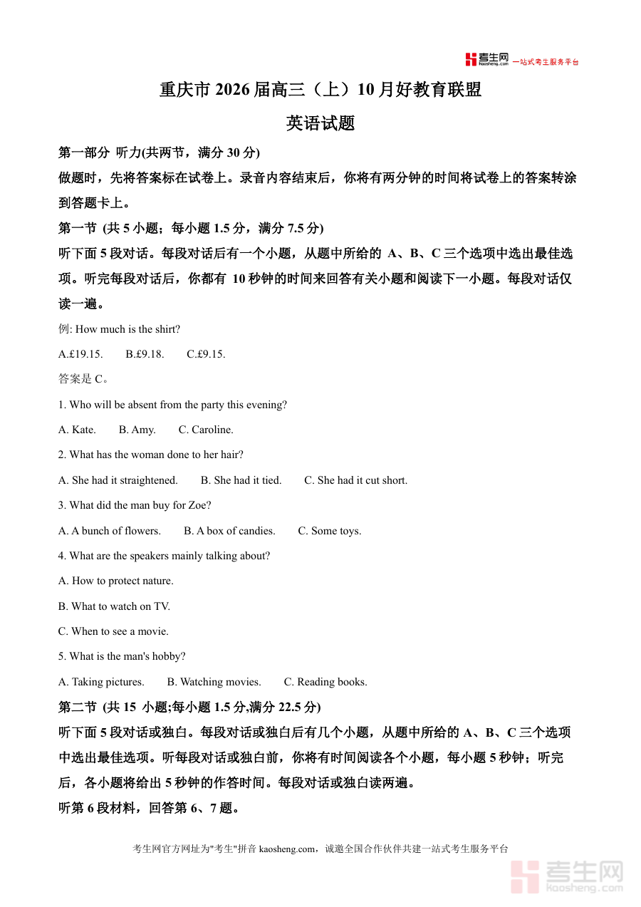 《精品解析:重庆市渝中区等地部分学校高2025-2026学年高三上学期10月好教育联盟考试英语试题(原卷版)》是一份针对高三学生英语备考的优质真题资料,由重庆市渝中区等地部分学校联合命题,涵盖听力、阅读等核心考试模块。该试题严格遵循高考英语命题规范,听力部分包含多段对话与独白,话题涉及日常交流、校园生活、自然探索等多元场景;阅读部分选取具有文化内涵的文本,如介绍联合国世界旅游组织认定的中国特色村落(如湖南十八洞村、安徽小岗村等),既考查语言理解能力,又融入文化元素。其特色亮点在于题型设置贴近高考实际,能帮助学生熟悉真实考试的出题思路与难度梯度。