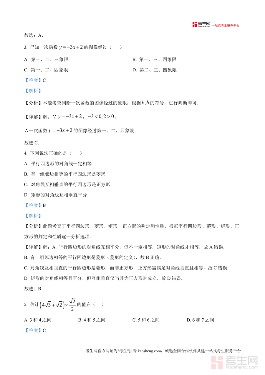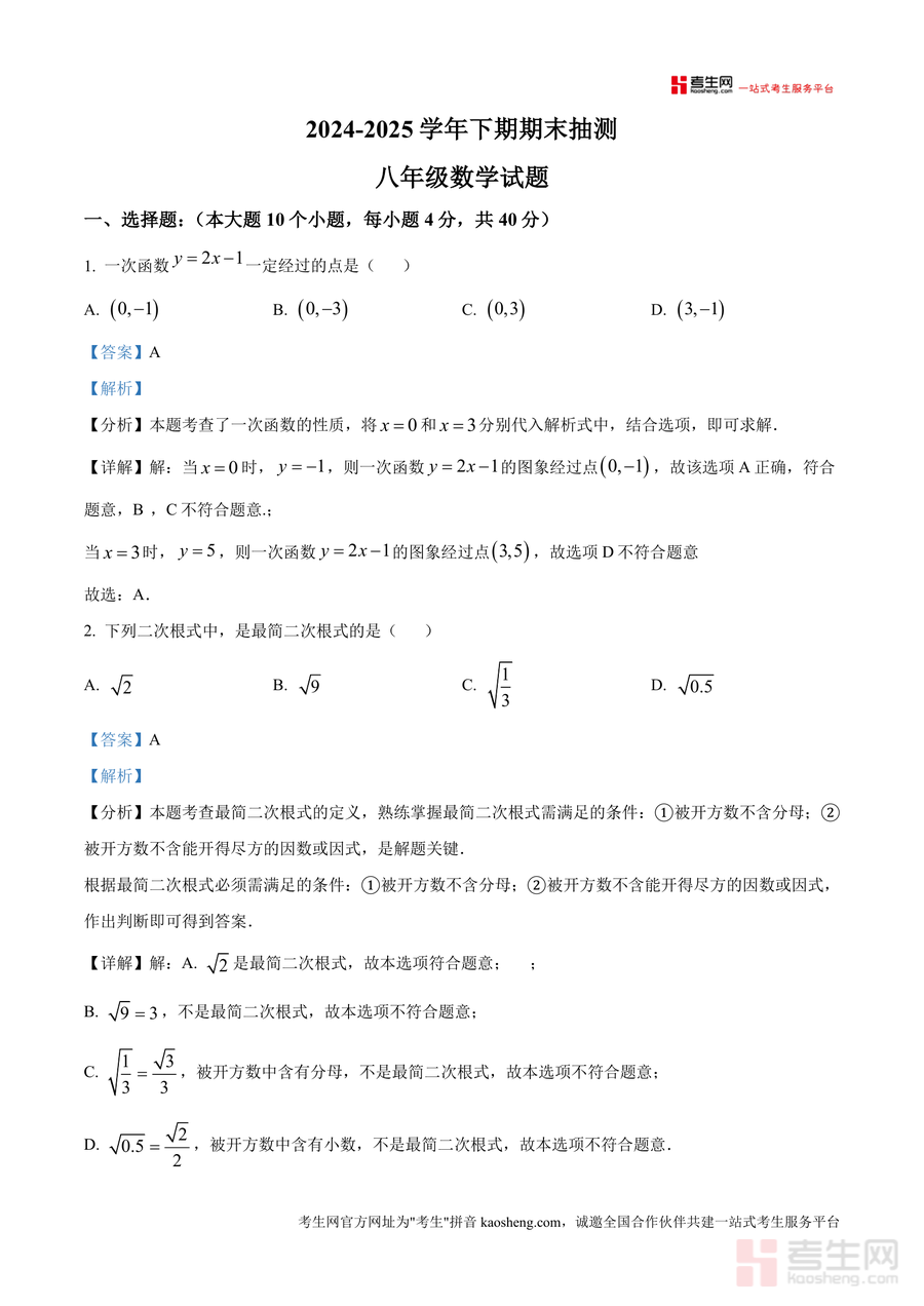 《精品解析:重庆市两江新区2024-2025学年八年级下学期期末抽测数学试题(解析版).docx》是一份针对该区域八年级下学期数学期末抽测的真题解析类备考资料,涵盖完整试题(选择题10道、填空题6道、解答题8道)及逐题深度解析。其特色亮点在于每道题均明确考点定位(如一次函数图像象限判断、最简二次根式定义)、呈现详细解题步骤与思路拓展(如几何图形规律归纳),还融入经典题型(如赵爽弦图应用)及新定义题型("四方数"运算)解析,帮助学生把握考点本质。