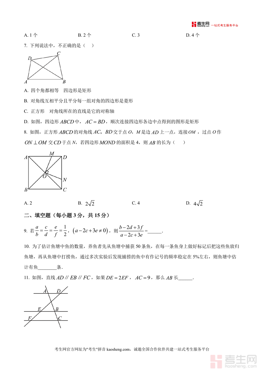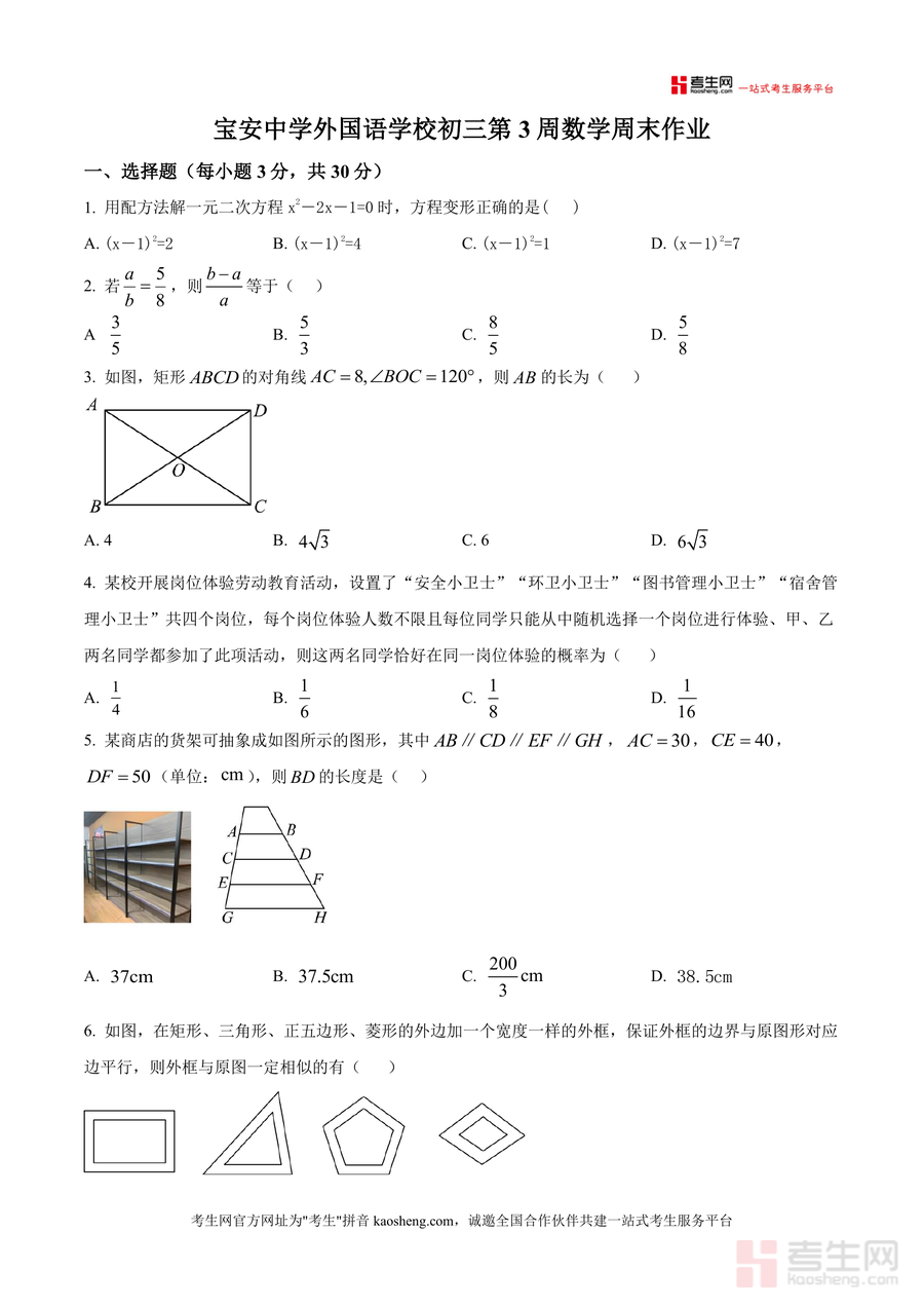 《精品解析:广东省深圳市宝安中学外国语学校2025-2026学年九年级上学期第三周周测数学试卷(原卷版).docx》是一份针对九年级上学期第三周数学学习内容设计的校本题目原卷资料。该试卷涵盖一元二次方程解法、概率计算、相似图形判定、特殊四边形性质、几何作图及函数应用等核心知识点,题型包括选择题(30分)、填空题(15分)和解答题(55分),全面覆盖九年级上学期初期数学学习重点。其特色在于严格贴合宝安中学外国语学校的教学进度与命题风格,题目设置兼顾基础巩固与能力拓展,能有效反映该校阶段性教学要求。